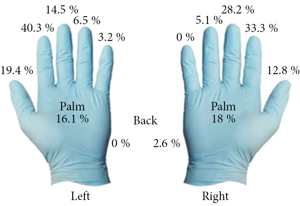 Assessment of the most frequently damaged areas of surgical gloves showed that damage to fingers I, II, and III of both gloves occurred in 74.25% of cases, with 37.6% of the damage occurring to finger II. A detailed study showed that, on the right hand, fingers II and III were most often damaged (33.3 and 28.2%, respectively). In contrast, the vast majority (40.3%) of damage on the left hand occurs to finger II (40.3%) (Fig. 3).
