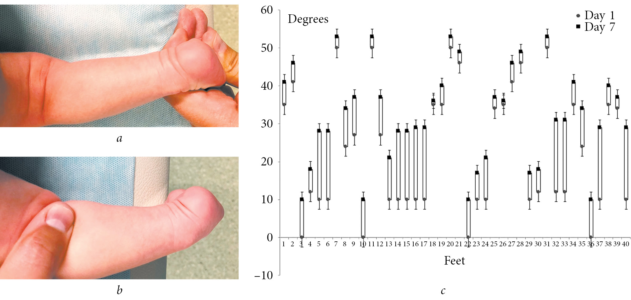 Thus, when assessed according to the Pirani scale, an increase in the severity of clubfoot by day 7 of life was noted in all patients. At the same time, an increase in internal and posterior contracture of all feet occurred by more than 70% over the 7 days. Additional points (from 0 to 1) were scored in all feet.