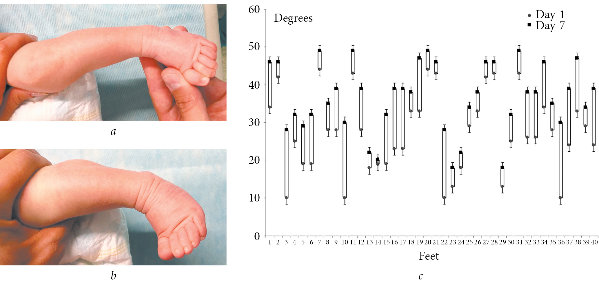 Fig. 1. Change in the angle of the equinus deformity: a — the angle of the equinus deformity upon examination on day 1 of life (23°); b — the angle of equinus deformity upon examination on day 7 of life (39°); c — graph of changes in the angle of equinus deformity for the follow-up period with demonstration of the increased bands and error bars for standard errors