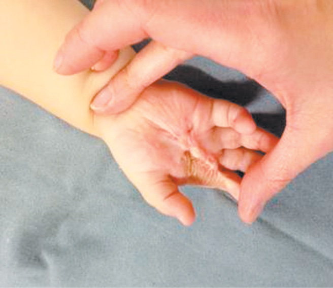 Fig. 1. Image of a 3-year-old patient diagnosed with flexion cicatricial contracture in the interphalangeal joints of the finger II due to retraction of the sieve skin autograft one year after skin restoration