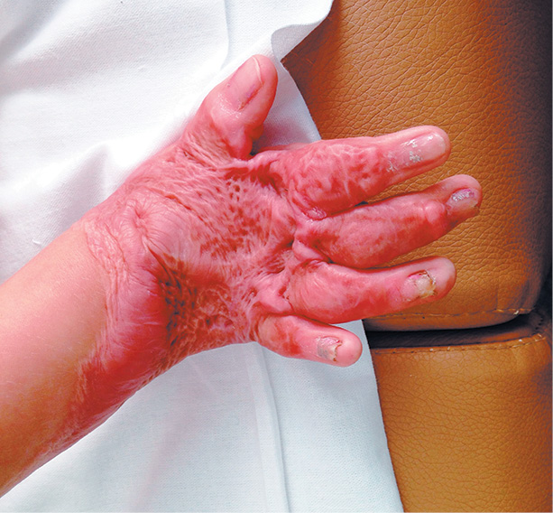 Fig. 2. Image of a 5-year-old diagnosed with extensor cicatricial contractures in the metacarpophalangeal joints of the fingers I–V, with adduction contracture in the metacarpophalangeal joint of the finger I, due to retraction of the sieve skin autograft 8 months after skin restoration