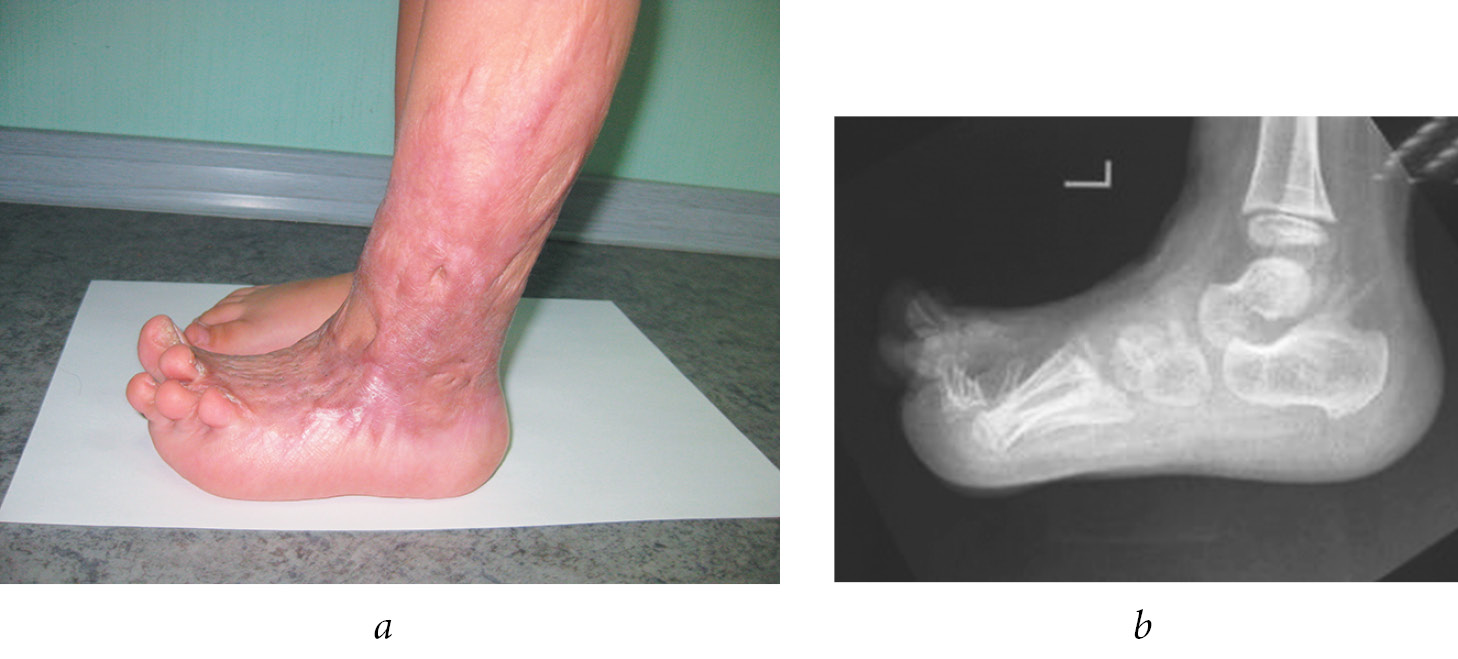 Fig. 4. Image of a 4-year-old diagnosed with extensor cicatricial contractures in the metacarpophalangeal joints of the left foot with dislocations one year after grafting the granulating wound of the foot dorsum with a sieve skin autograft. a — shortened planar scar of the left foot dorsum, extensor contractures in the metatarsophalangeal joints (clinical presentation); b — dislocations in the metatarsophalangeal joints (X-ray pattern)