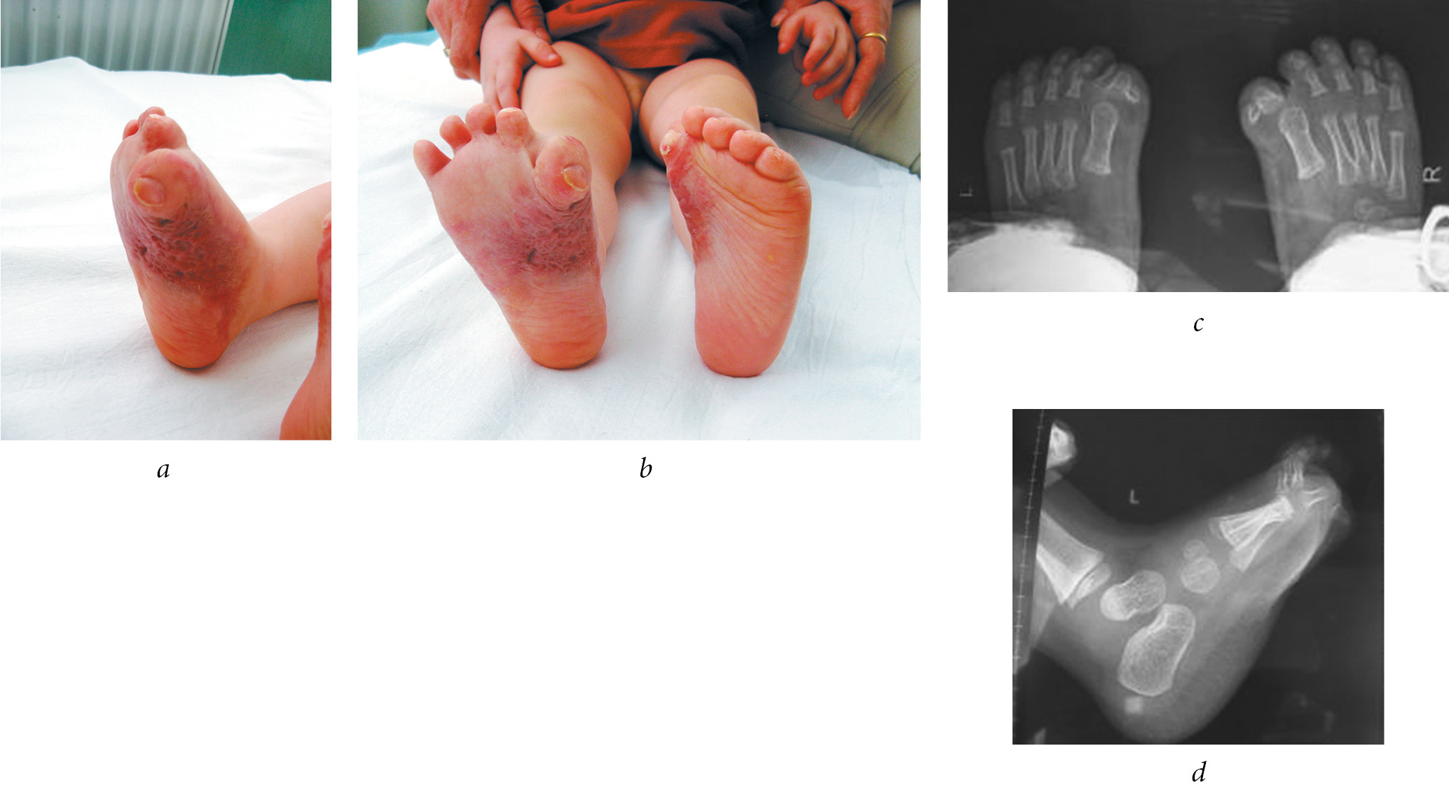Fig. 5. Image of a 2-year-old diagnosed with flexion scar contractures in the metatarsophalangeal joint of the toe I 9 months after the restoration of the skin using sieve skin autografts. a, b — flexion contractures in the metatarsophalangeal joint of the toe I, retraction and hypertrophy of the established sieve skin autograft (clinical presentation); c, d — dislocations in the interphalangeal joints of the toe I (X-ray pattern)
