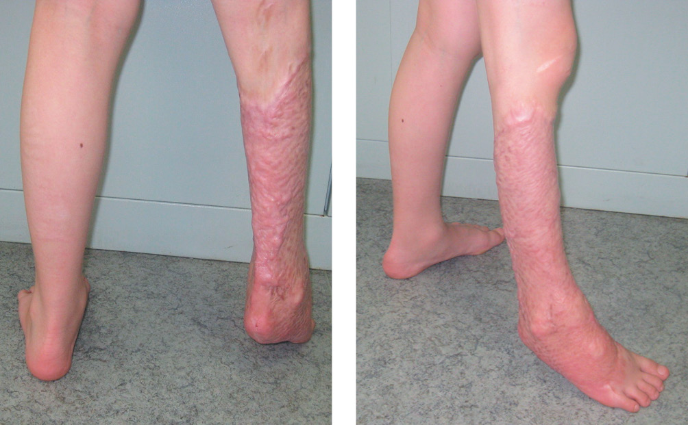 Fig. 6. Images of an 11-year-old patient diagnosed with flexion-extension contracture in the ankle joint 1.5 years after grafting of the granulating wound in the lower leg and ankle joint with a sieve skin autograft