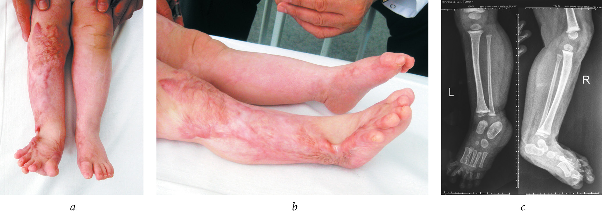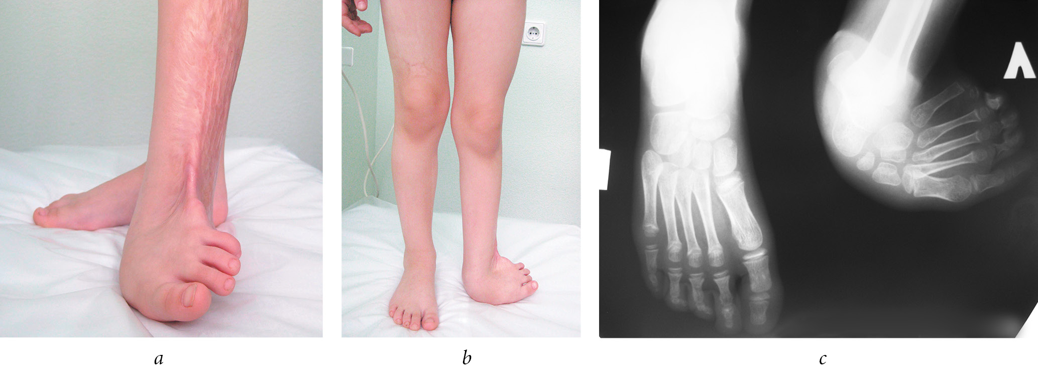 Fig. 8. Images of a 7-year-old diagnosed with multiplanar cicatricial deformity of the left foot 5 years after grafting the granulating wound of the lower leg and ankle joint with a sieve skin autograft. a — a shortened hypertrophic cicatricial cord along the edge of the established sieve skin autograft (clinical presentation); b — lateral displacement of the fore part of the left foot (clinical presentation); c — radiographic image showing supination decentration of the talus bone, rotational and equinus dislocation: complete dissociation of the talus and calcaneal bones at the level of the anterior articular facet, the forefoot in a pronounced supination position consensual with the calcaneal bone, the navicular bone is articulated with the medial-plantar surface of the head and neck of the talus bone