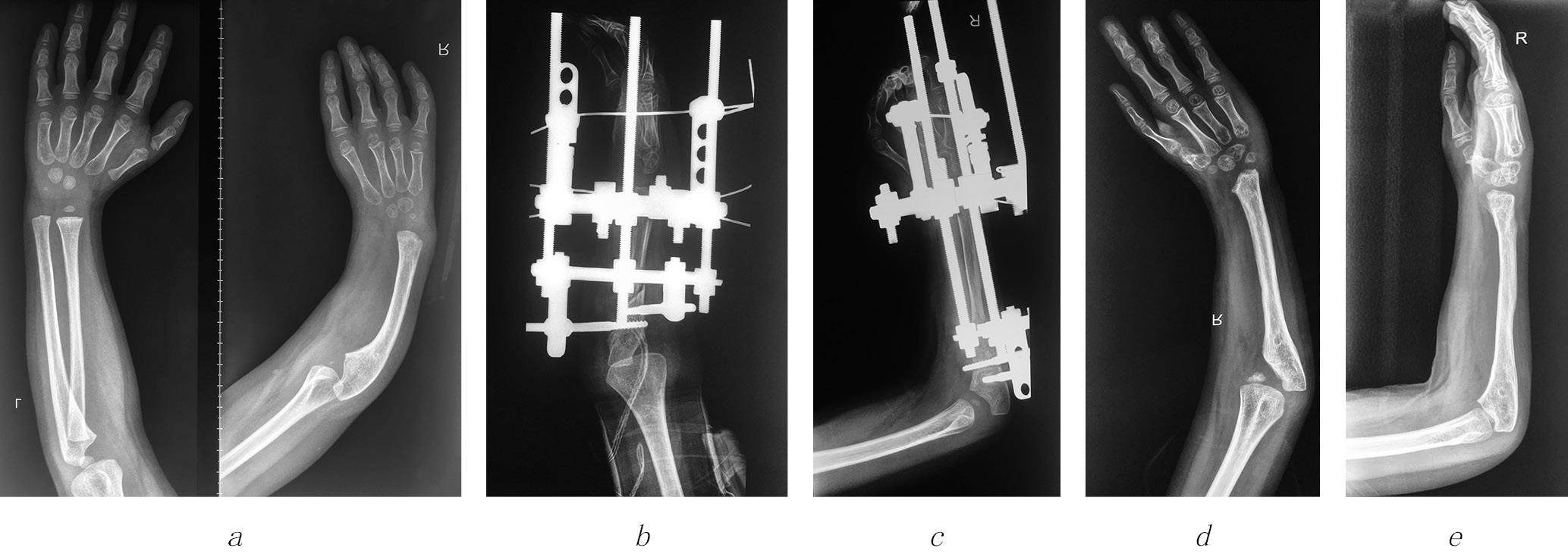 Fig. 1. Radiograph of the upper limb of patient P., 5 years old, before elongation of the ulnar bone (a), after osteotomy (b), at the end of the fixation period (c) and after 3 years (d, e)