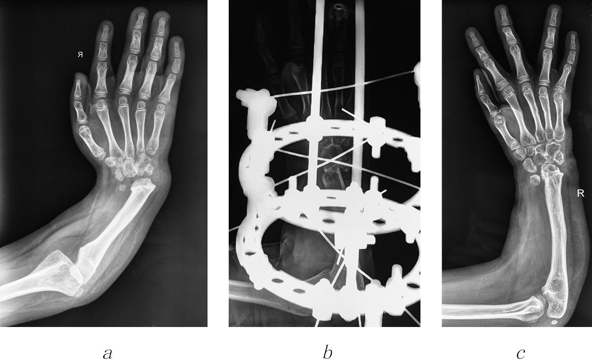 Distraction began on the fifth or seventh day after surgery by 0.25 mm, for three times a day. During the entire period of osteosynthesis, the patients received conservative treatment (physiotherapeutic treatment, exercise therapy, and massage). After the maturation of the distraction regenerate, the compression-distraction apparatus was dismantled and the upper limb was immobilized with a plaster cast or cylinder plaster cast.