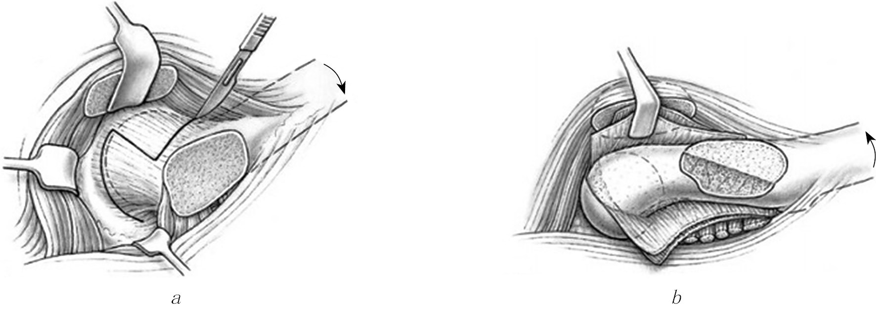 Fig. 1. Technique of the modified Dunn surgery: a — Z-shaped section of the joint capsule; b — subperiosteal femoral neck isolation [19]