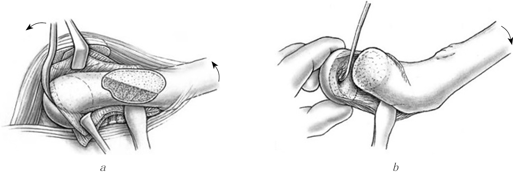 Fig. 2. Technique of modified Dunn surgery: a — osteotomy of the femoral neck; b — removal of the subepiphyseal trabecular bone with the remains of the growth plate [19]