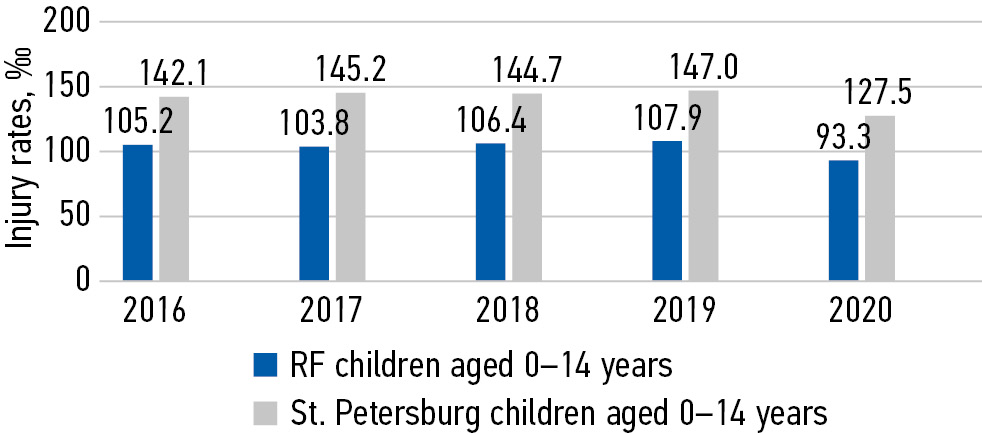 For many years, the overall injury rates were the highest in pediatric patients in St. Petersburg compared with those of the Russian Federation.
