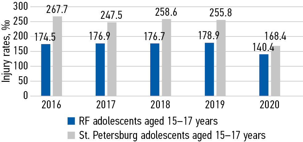 Fig. 2. Dynamics of the injury rates among adolescents aged 15–17 years in St. Petersburg and Russia in 2016–2020 (per 1000 population of corresponding age ‰)