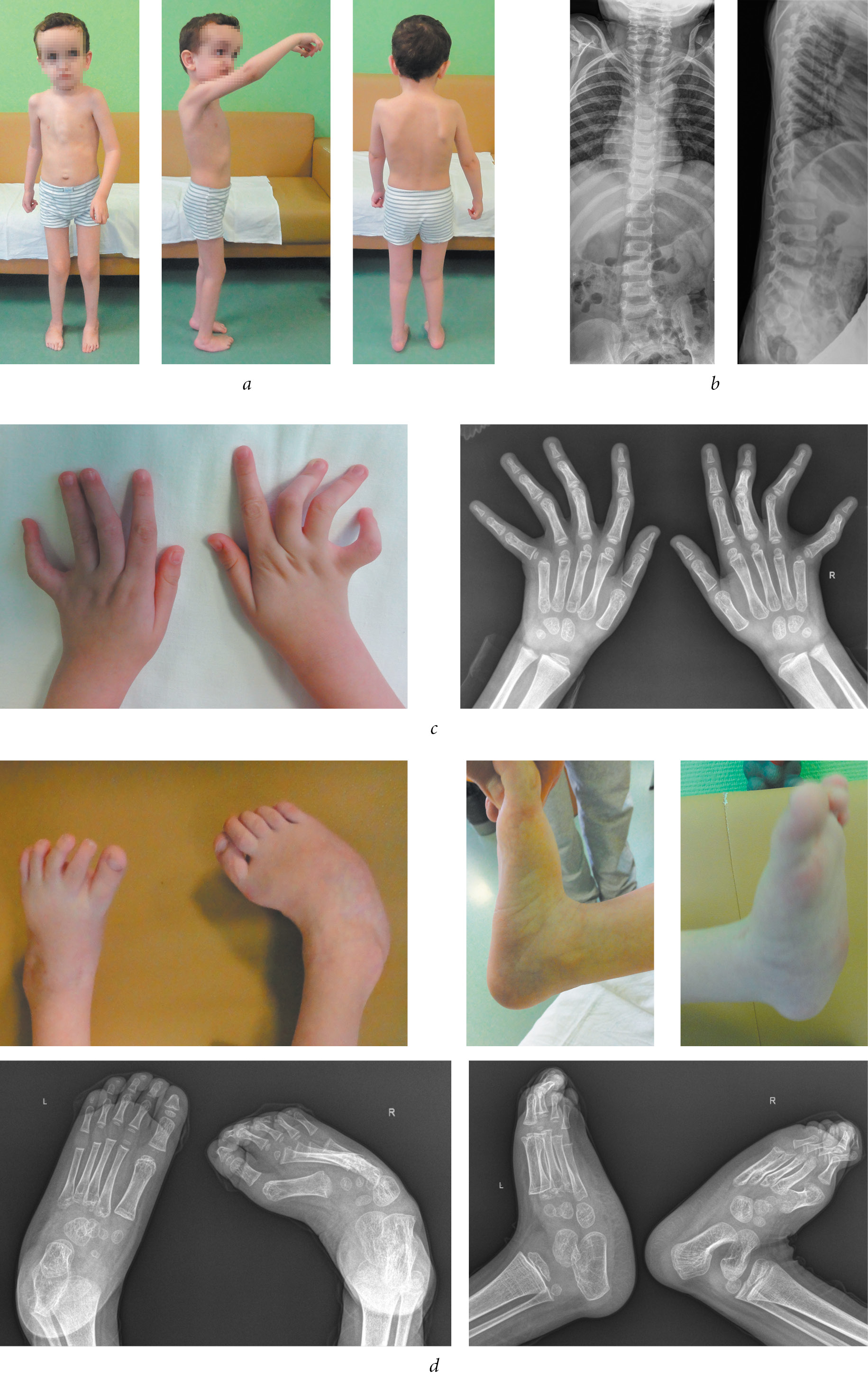 Patient A.: (a) Appearance of the patient; (b) radiographs of the spine; (c) appearance and radiographs of the hands; (d) appearance and radiographs of the feet