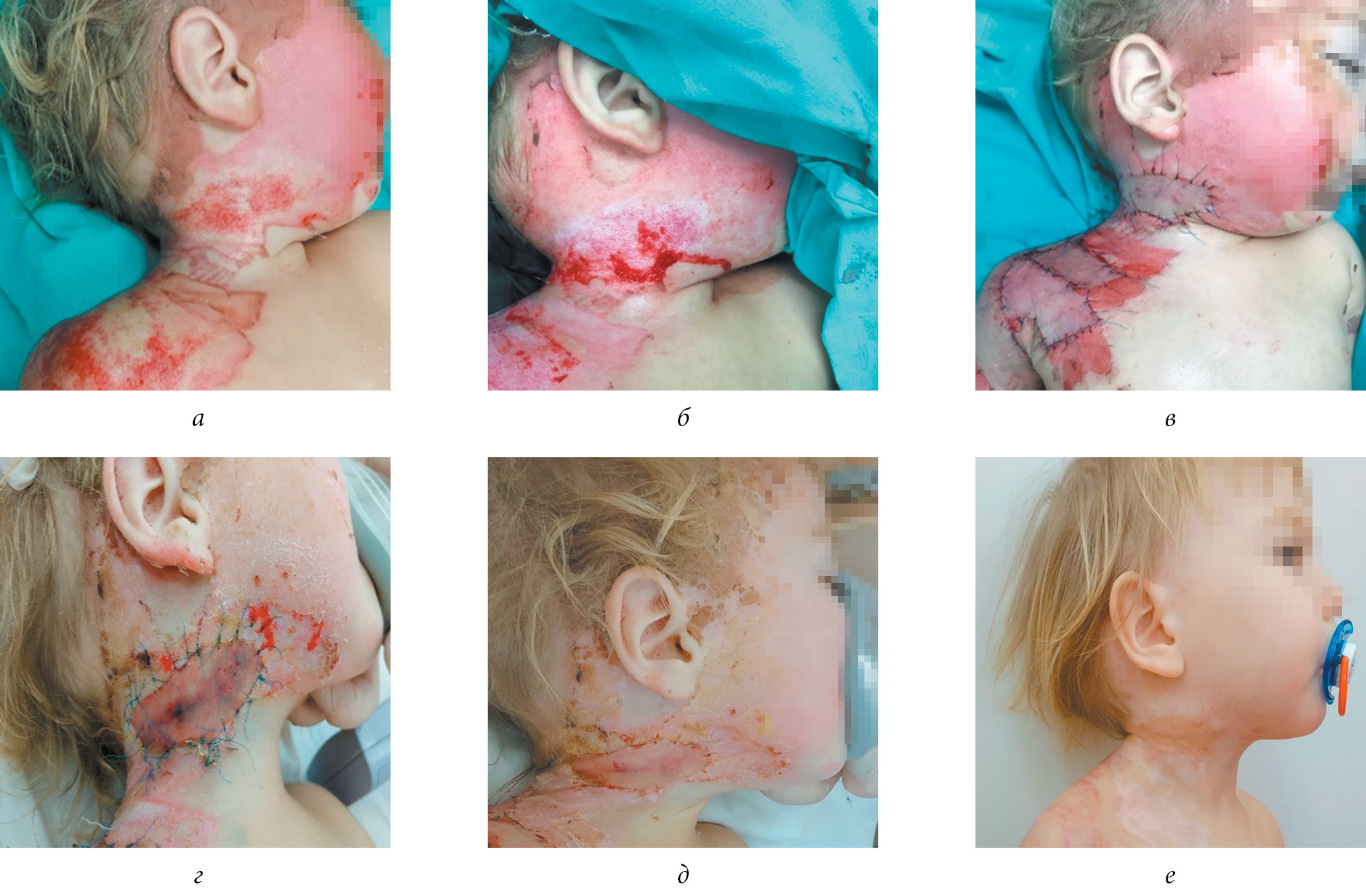 Рис. 1. Ребенок К., 1 год 2 мес. Диагноз: «Термический ожог II–IIIа и б cтепеней лица и правой боковой поверхности шеи»: а — 3-е сутки после ожога. Рана представлена сухим пестрым струпом; б — вид раны после тангенциальной некрэктомии, дно раны представлено глубоким кровоточащим слоем дермы; в — ожоговая рана после выполнения аутодермопластики. Трансплантат фиксирован к краям раневого дефекта отдельными узловыми швами мононитью; г — 3-е сутки после раннего хирургического лечения. Трансплантат розовый, плотно прилегает к ране. Определяется единичная гематома небольшого размера, которая будет опорожнена; д — 9-е сутки после раннего хирургического лечения. Площадь приживления трансплантата 100 %. Швы сняты. Восстановление кожного покрова завершено; е — 6 мес. после раннего хирургического лечения. Ретракции трансплантата нет. Рубцовой деформации и контрактуры нет