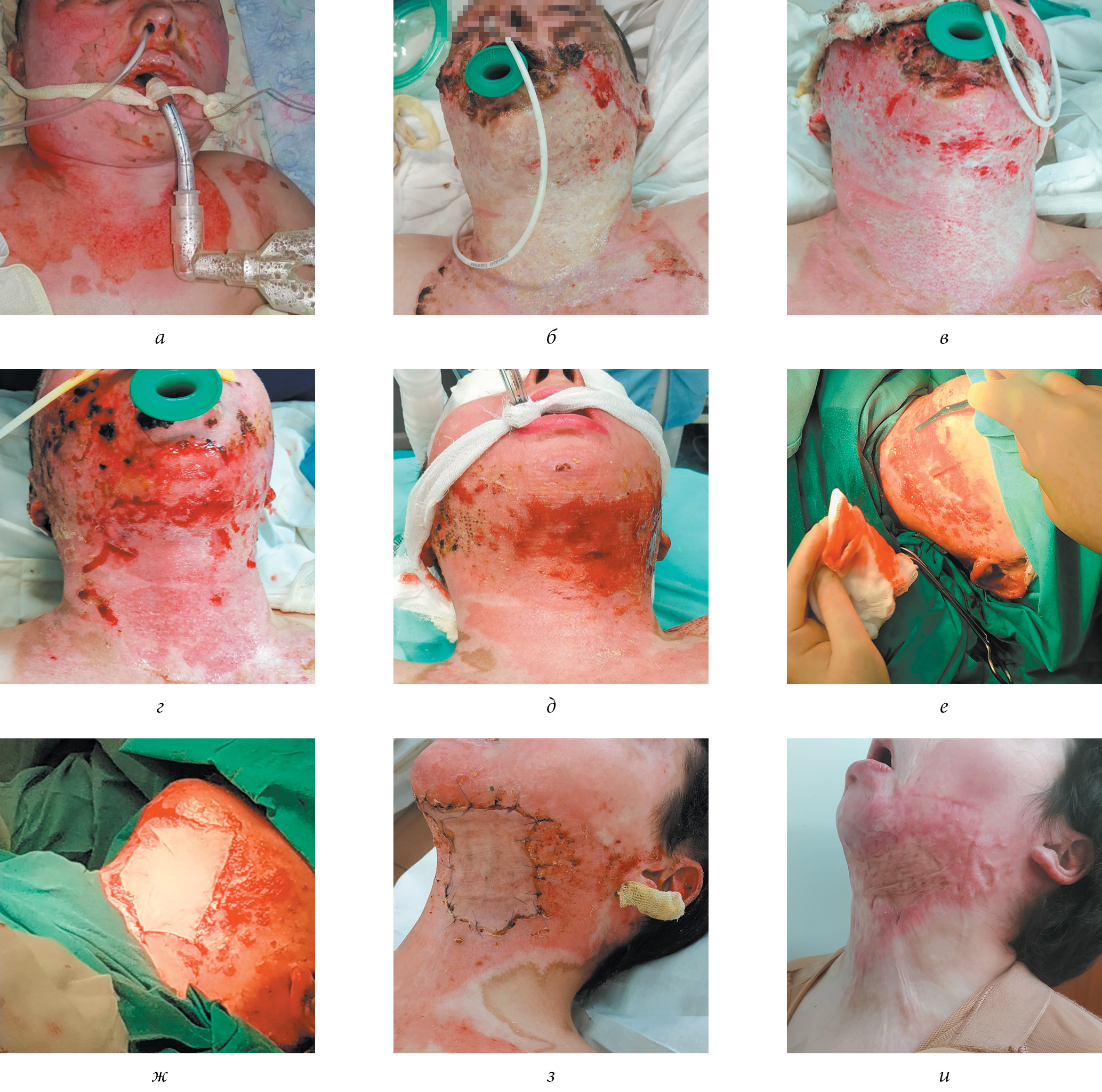 Рис. 2. Ребенок Д., 15 лет. Диагноз: «Термический ожог II–IIIа и б cтепеней лица и шеи»: а — 2-е сутки после ожога; б — 9-е сутки после травмы, вид раны после перевязок с сульфадиазином серебра; в — 15-е сутки после травмы, рана активно очищается от некротических тканей на фоне применения гидроколлоидных повязок и дебридмента губкой Debrisoft®; г — 18-е сутки после травмы, рана полностью очистилась от некротических тканей; д — 24-е сутки после травмы, рана готова к аутодермопластике; е — обработка гранулирующей раны металлическим дебридером; ж — распределение трансплантата на ране; з — 9-е cутки после аутодермопластики. Площадь приживления трансплантата 100 %; и — 6 мес. после аутодермопластики. Отмечается ретракция трансплантата, рост гипертрофического рубца по периферии, а также формирование контрактуры