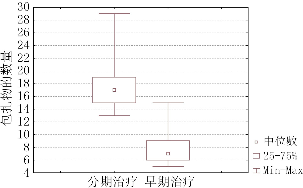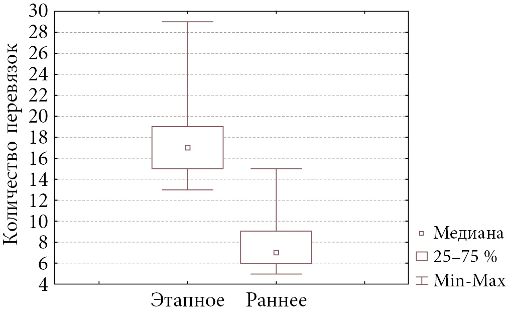 Рис. 4. Коробчатые графики значений количества перевязок при раннем и этапном хирургическом лечении: в подавляющем большинстве случае при раннем хирургическом лечении требовалось меньшее количество перевязок (в среднем — на 8 перевязок меньше)