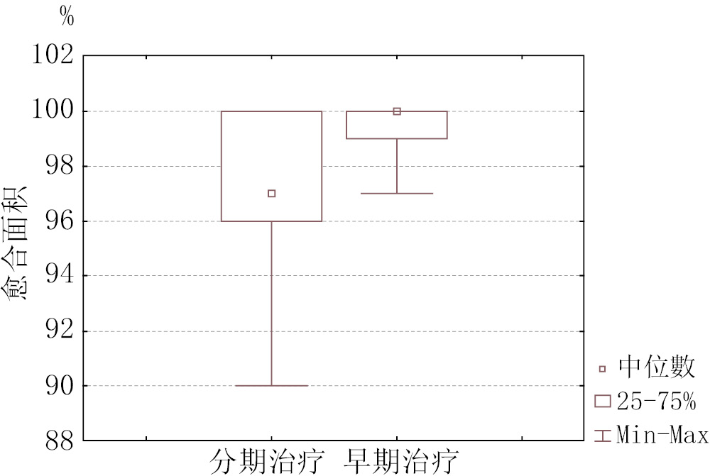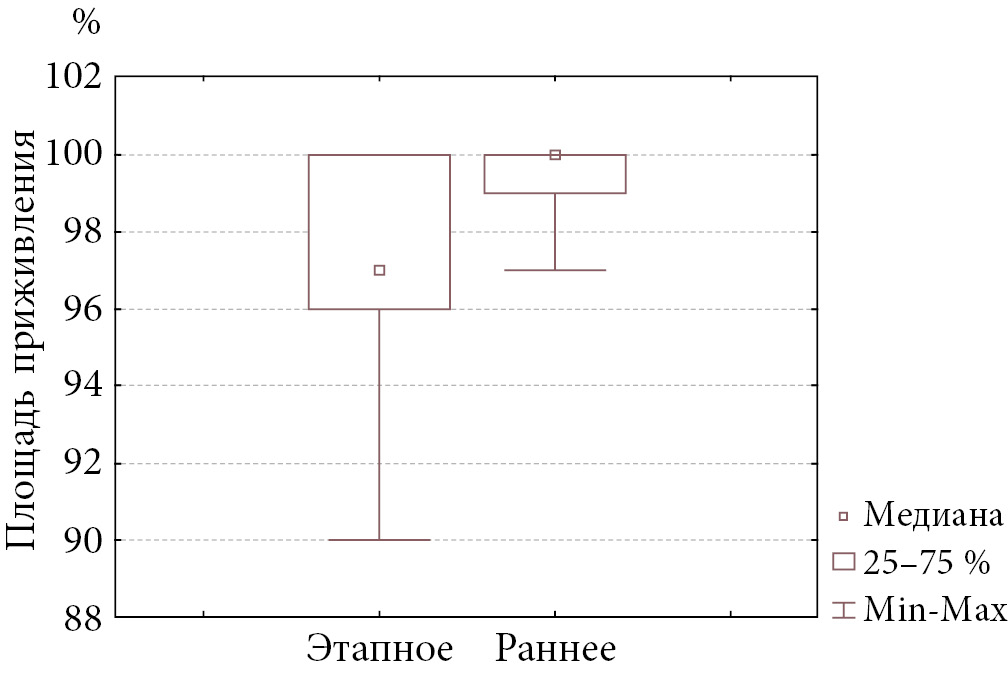 Рис. 5. Коробчатые графики значений площади приживления трансплантата при раннем и этапном хирургическом лечении. Площадь приживления трансплантатов была больше при раннем хирургическом лечении (в среднем — на 5 % больше)