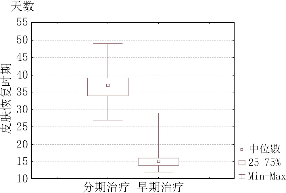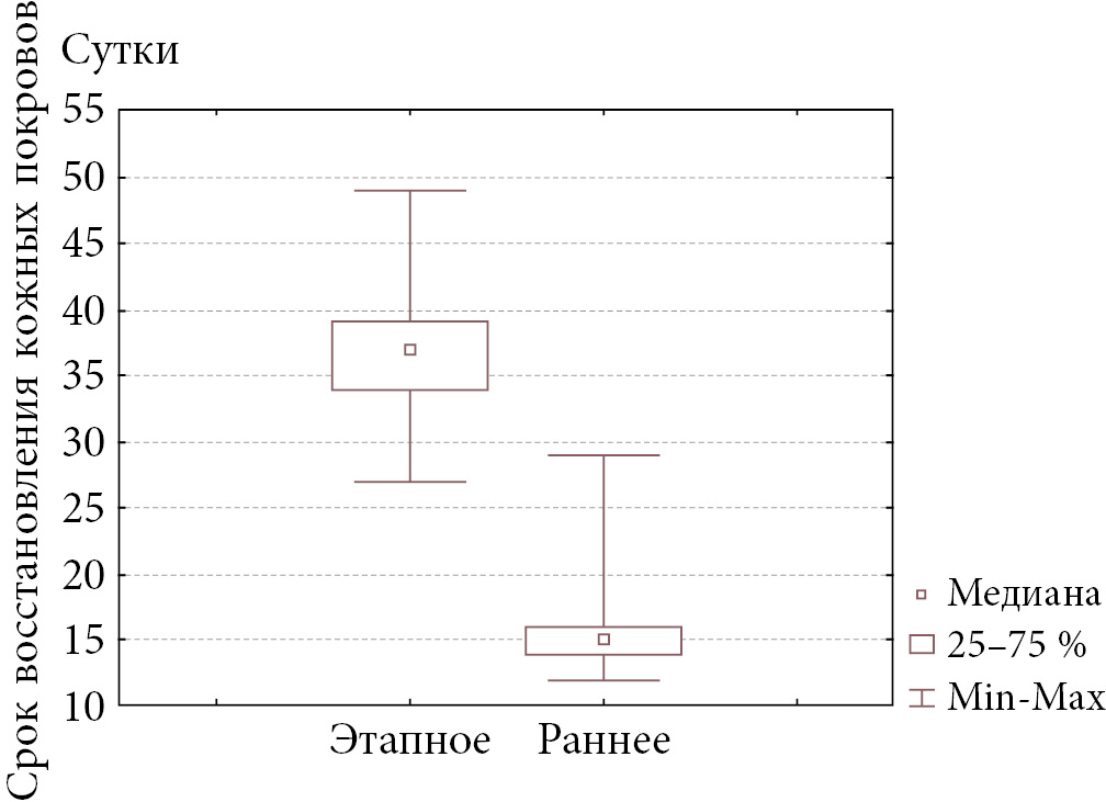 Рис. 6. Коробчатые графики значений срока восстановления кожных покровов при раннем и этапном хирургическом лечении. При раннем хирургическом лечении восстановление кожных покровов проходило значительно быстрее, чем при этапном (в среднем — на 20 сут быстрее)