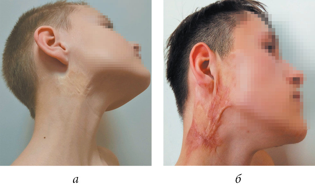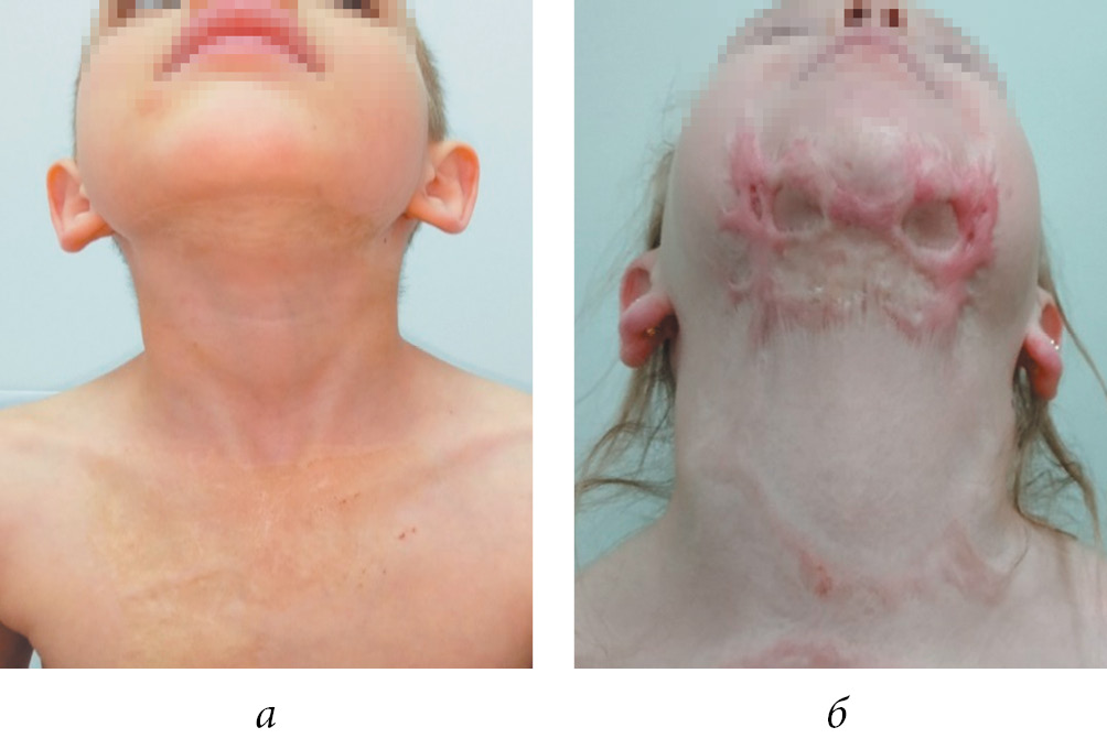 The neck, like the face, represents an area that has high aesthetic and functional significance [1]. Neck burns in pediatric patients are common. According to various authors, from 7.3% to 20.5% of all victims with burns to the face and neck need surgical restoration of the skin [2, 3]. Deep neck burns in children are registered four times more often than deep face burns [4]. The outcomes of such an injury are usually cicatricial deformities, which result in facial tissue tension and, in severe cases, in tracheal deformity [5]. Post-burn contractures of the neck have a psychosocial effect on the patients; moreover, they can give an idea of suicide [6]. In adults, such cicatricial deformities are static, but in children, during their growth, their severity may increase [5, 7]. It is known that in case of epithelization of burn wounds, for a period of more than 3 weeks, adverse consequences occur in the form of hypertrophic or keloid scars [8, 9]; therefore, combustiologists resort to early surgical treatment of patients with burns and seek to restore the skin as quickly as possible. However, there is still no consensus on the timing of surgical interventions in the neck; perforated skin autografts are still used even in case of the lack of shortage of donor resources [9–11]. And only the need for a tracheostomy in patients with deep neck burns is an indication for early surgical treatment in this area [12–14]. Currently, there is limited literature data on the treatment of deep neck burns in pediatric patients.