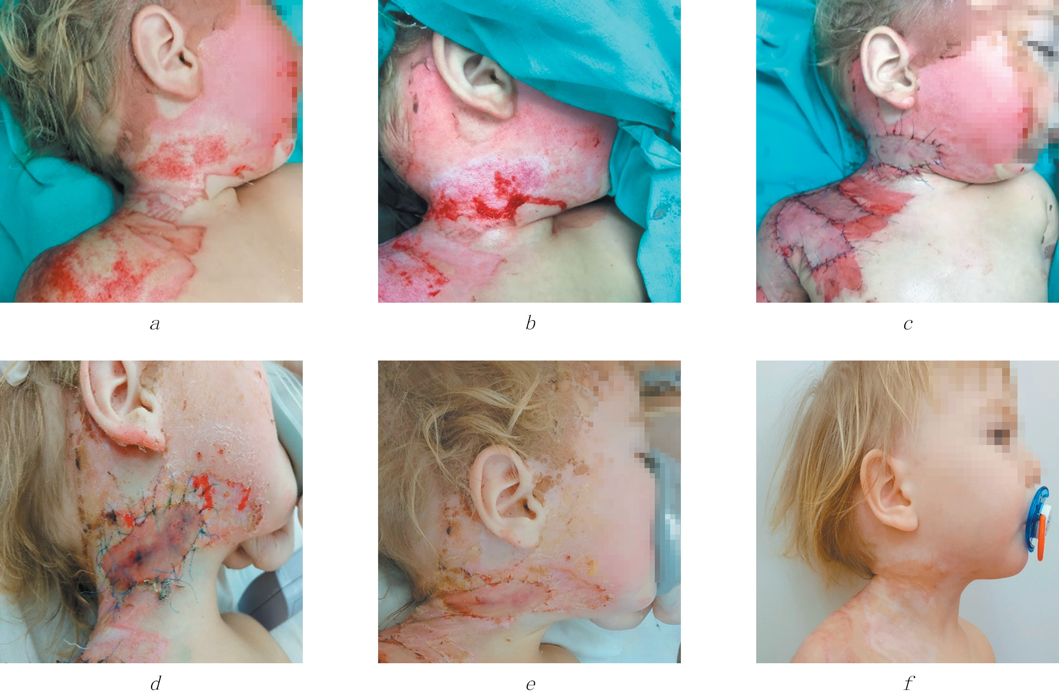 В процессе этапного лечения детей беспокоили зуд и болевой синдром, которые мешали носить воротник Шанца. Время подготовки ран к аутодермопластике в среднем составляло 27,17 ± 0,18 дня. Вторичную аутодермопластику при этапном лечении также проводили под эндотрахеальным наркозом. Положение ребенка на операционном столе было аналогично положению при раннем хирургическом лечении. Окаймляющим разрезом по контурам гранулирующей раны хирург иссекал формирующийся рубцовый валик, затем металлическим дебридером удалял верхний слой грануляционной ткани. Если на площади раневой поверхности присутствовали островки эпителизации, то их тоже удаляли дебридером или скальпелем. Этап аутодермопластики и наложения повязок ничем не отличался от этапа аутодермопластики при раннем хирургическом лечении. В дальнейшем в послеоперационном периоде трансплантат и донорскую рану перевязывали так же, как и при раннем хирургическом лечении. Пример классического этапного лечения представлен на рис. 2.