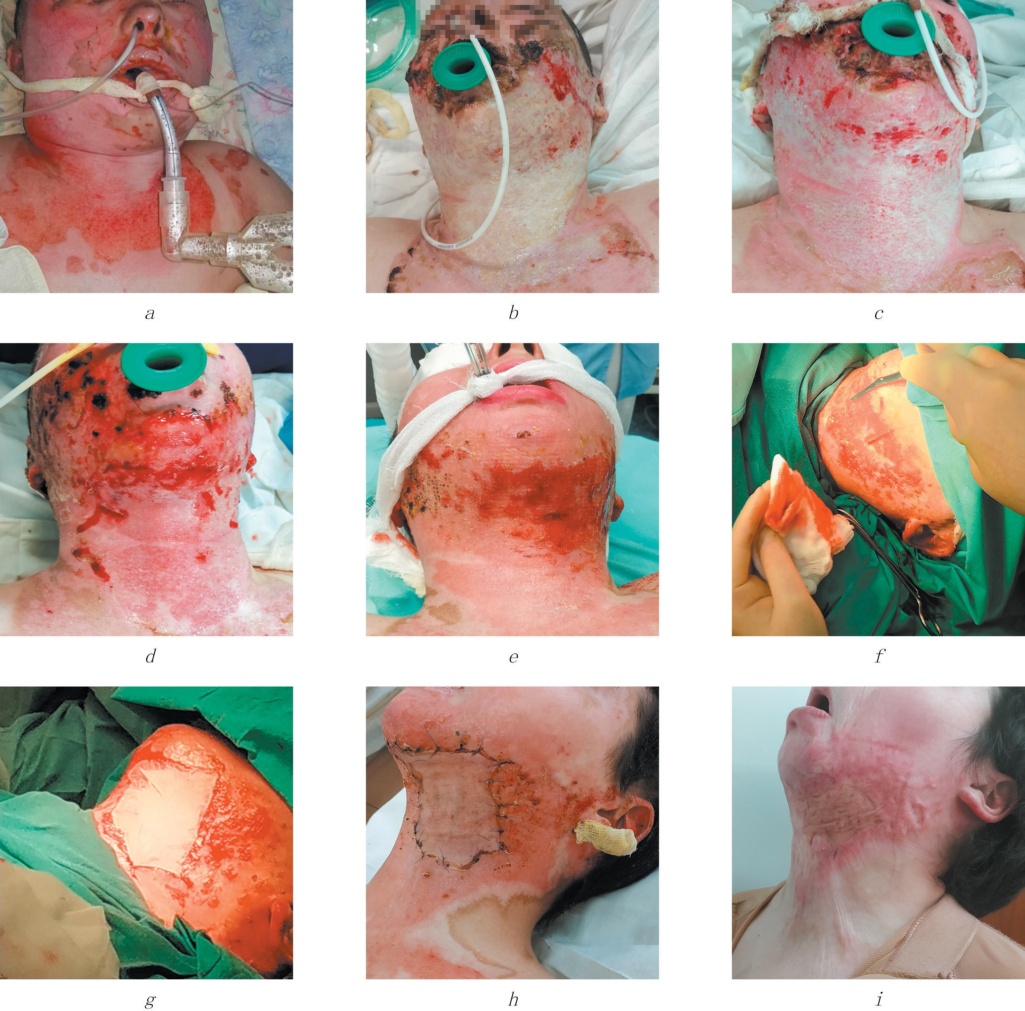 Раннее хирургическое лечение в среднем проводили на 3,37 ± 0,14 сутки от момента травмы. Все оперативные вмешательства осуществляли под эндотрахеальным наркозом. Пациент лежал на спине с запрокинутой назад головой для оптимального доступа хирурга к операционному полю. Под лопатки подкладывали мягкий валик. Стерильным хирургическим маркером размечали зону некрэктомии. Затем электродерматомом (Aesculap GA630 и 3Ti, Aesculap Inc. А. B. Braun Group Co, США), или ножом Века (Weck blade, Rica Surgical Products Inc., CША), или электроножом послойно иссекали ожоговый струп до появления диффузного кровотечения из глубоких слоев дермы или жизнеспособной подкожно-жировой клетчатки. Нож Века использовали при некрэктомии в области подбородочно-шейного угла, где невозможно расположить лезвие электродерматома из-за его размеров. Во всех случаях донорским участком для забора аутокожи служило бедро пациента. Электродерматомом с установленным новым лезвием срезали расщепленный кожный трансплантат толщиной 0,2 мм и подшивали к краям раневого дефекта в области шеи. Данная толщина трансплантата обеспечивала эпителизацию донорских ран в течение 10–14 дней, что минимизировало косметический дефект, и в дальнейшем, при необходимости, донорский участок можно было использовать повторно.