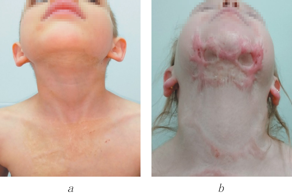 Шея, так же как и лицо, представляет собой область, обладающую высокой эстетической и функциональной значимостью [1]. Ожоги шеи у детей встречаются часто. По данным различных авторов, от 7,3 до 20,5 % всех пострадавших с ожогами лица и шеи нуждаются в хирургическом восстановлении кожных покровов [2, 3]. Глубокие ожоги шеи у детей наблюдаются в 4 раза чаще, чем глубокие ожоги лица [4]. Исходами такой травмы обычно являются рубцовые деформации, приводящие к натяжению тканей лица, а в тяжелых случаях к деформации трахеи [5]. Послеожоговые контрактуры шеи оказывают психосоциальное воздействие на пострадавших, в том числе приводят к мыслям о суициде [6]. Если у взрослых подобные рубцовые деформации носят статичный характер, то у детей в процессе роста их тяжесть может увеличиваться [5, 7]. Известно, что в случае эпителизации ожоговых ран сроком более 3 нед. наступают нежелательные последствия в виде формирования гипертрофических или келоидных рубцов [8, 9], поэтому комбустиологи прибегают к раннему хирургическому лечению обожженных и стремятся восстановить кожный покров как можно быстрее. Однако до сих пор отсутствует единое мнение о сроках проведения оперативных вмешательств в области шеи, по-прежнему используются перфорированные кожные аутотрансплантаты даже в случаях, когда дефицита донорских ресурсов нет [9–11]. И только необходимость в трахеостомии у пациентов с глубокими ожогами шеи служит показанием к раннему хирургическому лечению в этой области [12–14]. В настоящее время литературные данные по лечению глубоких ожогов шеи у детей ограничены.