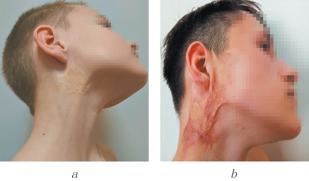 Рис. 8. Косметический результат после лечения глубокого ожога правой боковой поверхности шеи: а — мальчик Ш., 10 лет, после раннего хирургического лечения (гиперпигментация трансплантата, роста рубцовой ткани нет); б — мальчик Г., 13 лет, после этапного лечения глубокого ожога (разрастание гипертрофического рубца по периферии от трансплантата, тянущий рубец в области угла нижней челюсти)