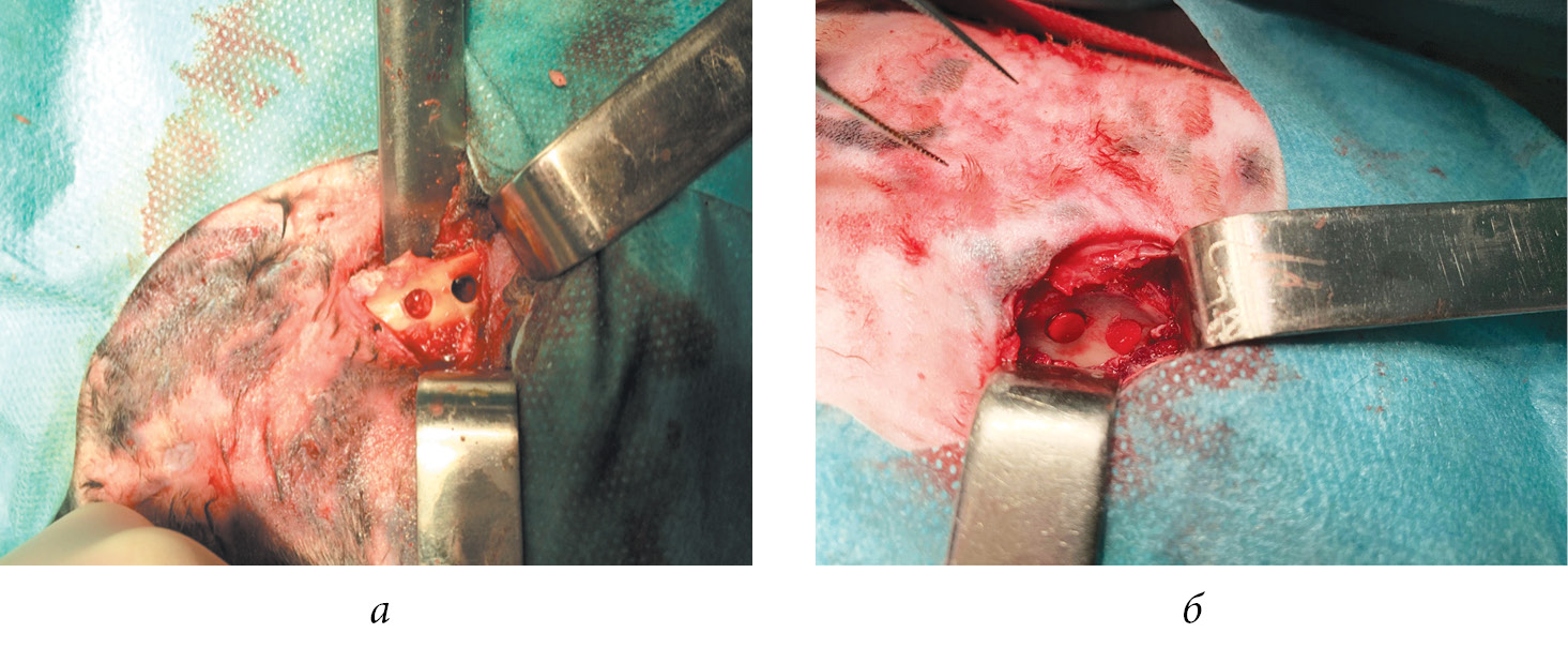 Рис. 1. Внешний вид зоны смоделированного дефекта: а — зона дефекта до имплантации исследуемых материалов; б — зона дефекта с имплантированными губчатыми материалами на основе хитозана
