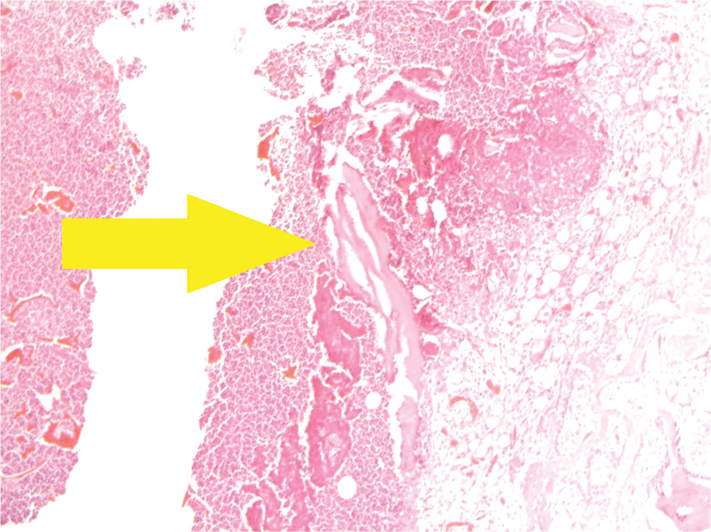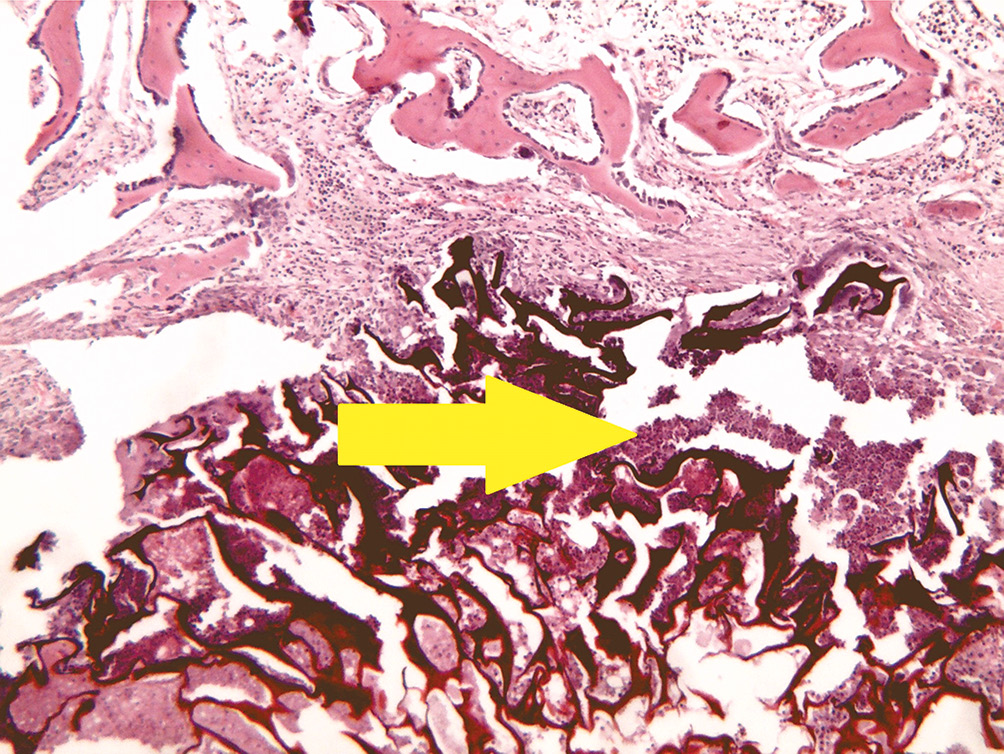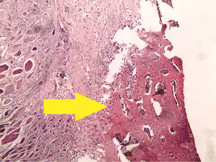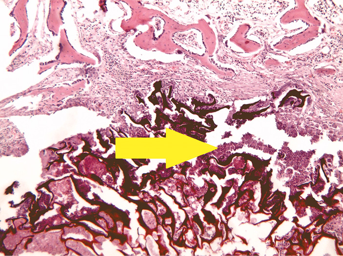 В зоне дефекта костной ткани находится большое количество некротического детрита с множественными густо лежащими нейтрофильными лейкоцитами. К зоне дефекта и окружающей костной ткани прилежат надкостница и небольшие фрагменты поперечно-полосатой мышечной ткани с очаговой лимфогистиоцитарной инфильтрацией и единичными в поле зрения гигантскими многоядерными клетками типа инородных тел.
