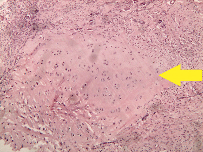 Рис. 5. Группа с протезом из хитозана с гидроксиапатитом: хрящевые островки среди грубоволокнистой ткани в зоне костного дефекта. Окраска гематоксилином и эозином, увеличение ×40