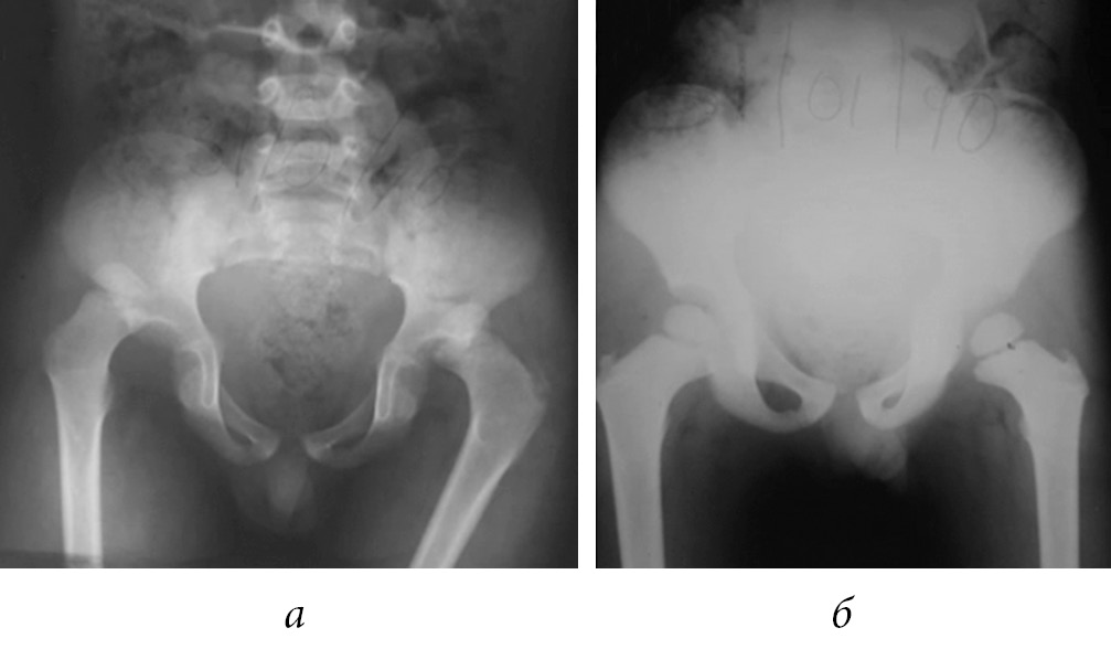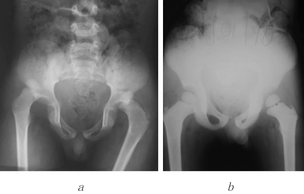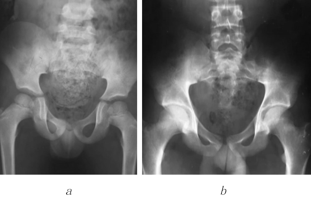 Fig. 2. Pelvis X-ray after 12 months of follow up (a); last X-ray control. Pelvis after 12 years of follow up with skeletal maturity achieved (b)
