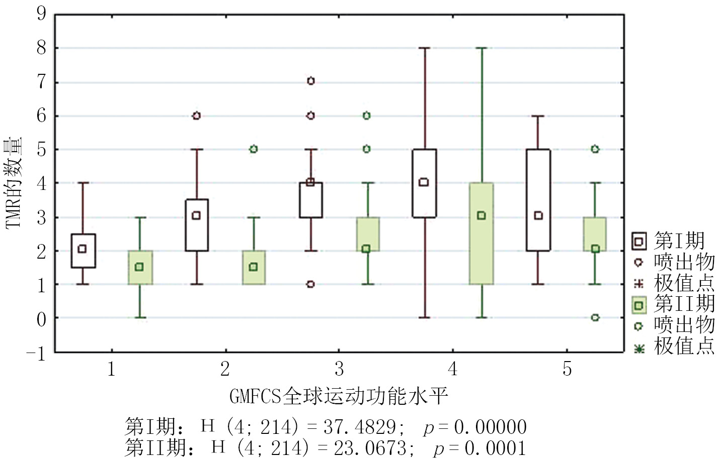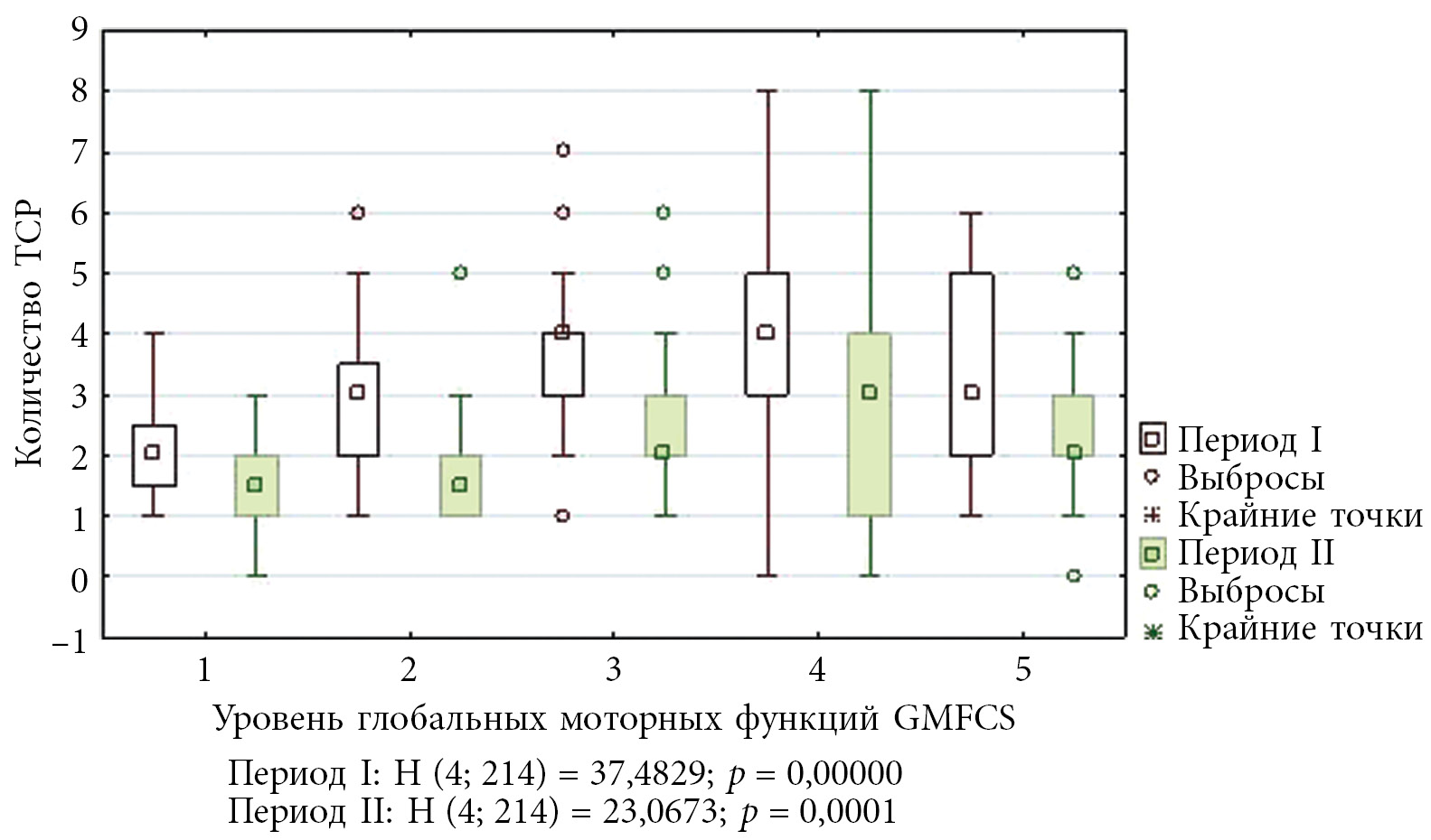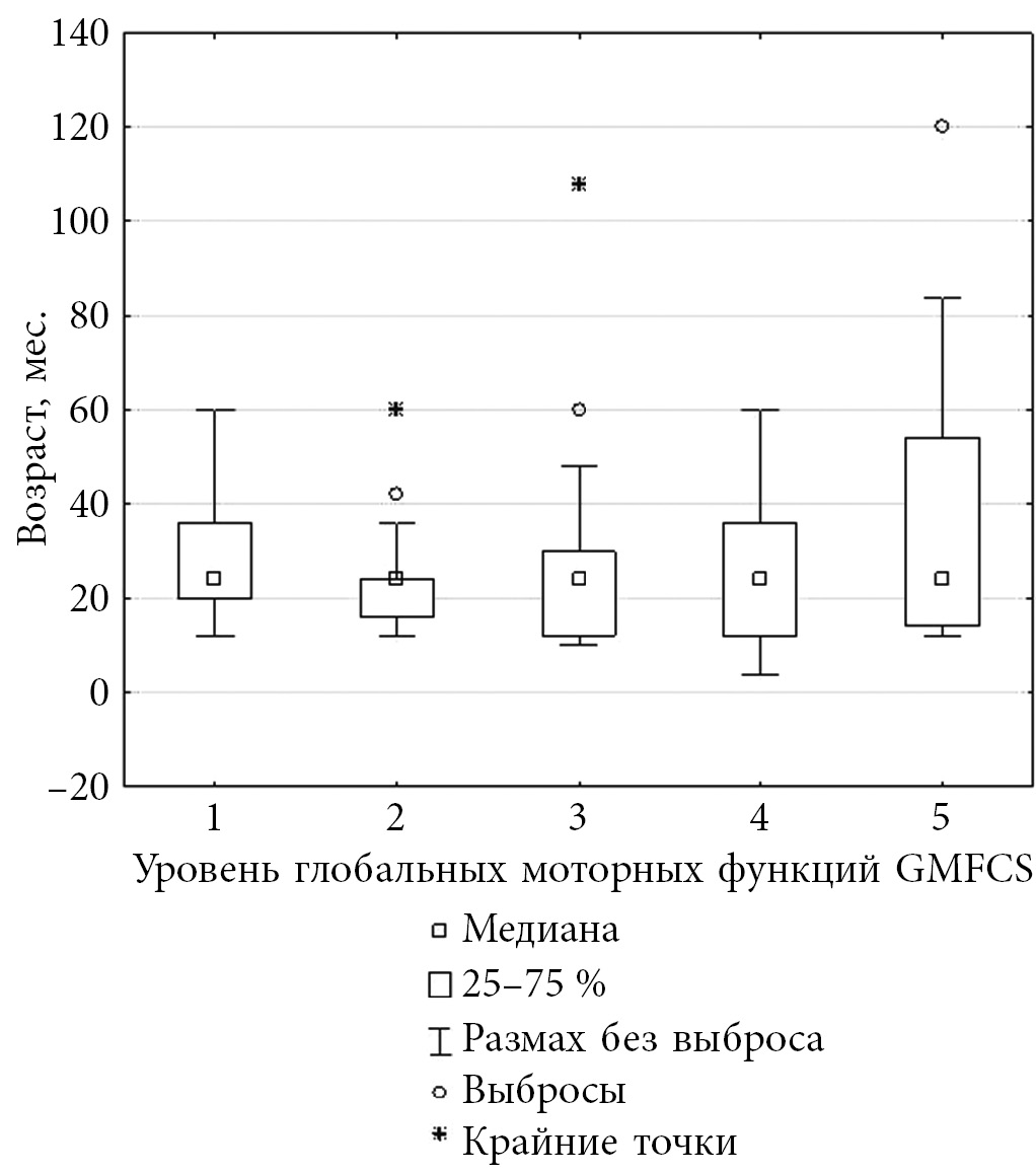 All patients were distributed into five groups by the classification of disorders of the level of the GMFCS [7]. According to this distribution, 28 patients (13.1%) had the recorded GMFCS level of 1, 36 patients (16.8%) had GMFCS 2, 61 patients (28.5%) had GMFCS 3, 62 patients (29.0%) had GMFCS 4, and 27 patients (12.6%) had GMFCS 5. Thus, the maximum number of patients had recorded levels of GMFCS 3 and 4, whereas patients with GMFCS levels 1 and 5 were the least numerous. The distribution by gender was homogeneous. The average age of the patients under study was 8.2 ± 3.7 years, the proportion of pediatric patients over the age of four years was 93%, and that over six years old was 69%.
