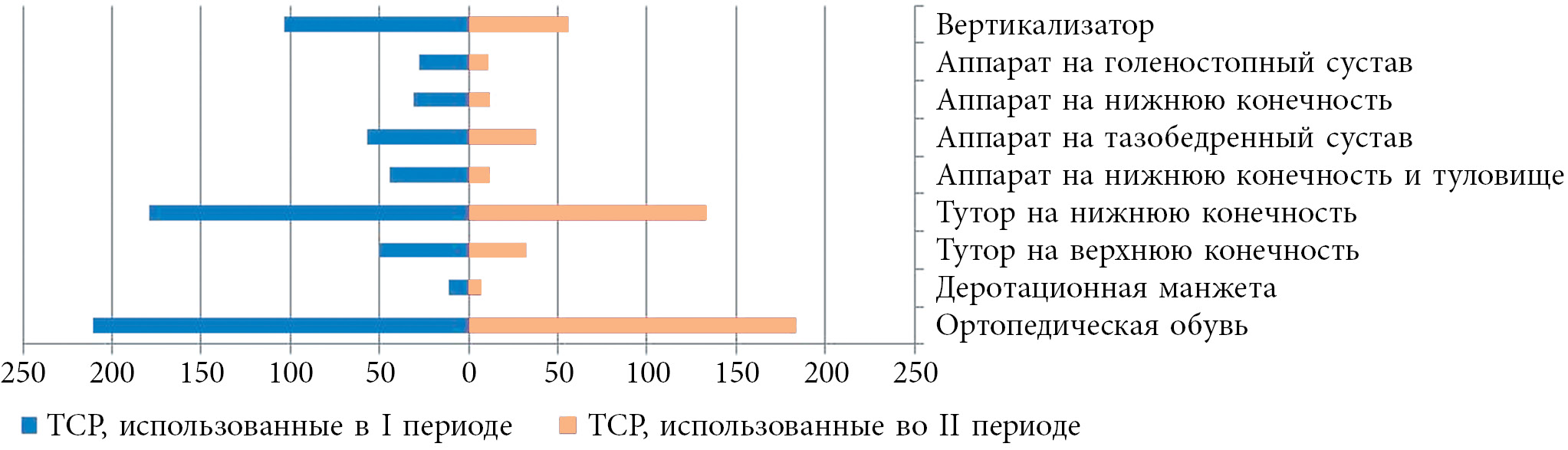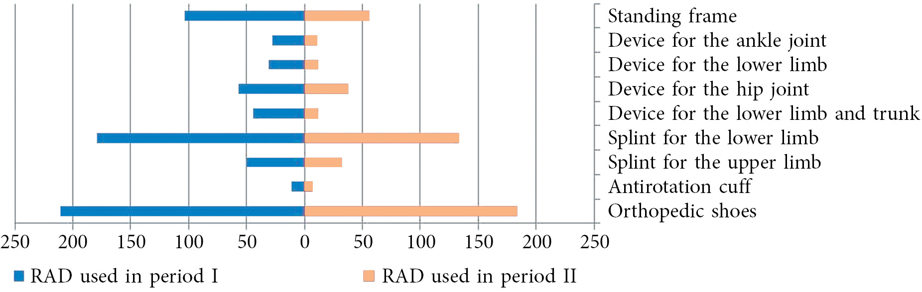 It was revealed that patients used orthopedic shoes and splints for the lower limb of various designs most stably. The frequency of their use in period II was 87% and 75%, respectively, of the same indicator in period I. In the structure of functional orthoses, the frequency of using devices for hip joints in period II was the highest among all similar orthoses (67%). The number of patients who continued to use devices for the entire lower limb and ankle joint was comparable (39% each). Only 12 of 44 patients repeatedly used one of the most complex orthoses (the “tee” type device for the lower limbs and the trunk), which amounted to 27%. The antirotation cuff was chosen by patients and their parents most rarely of all the RAD studied. In period I, only 11 pediatric patients used it, whereas only seven (64%) of them continued to use this product in period II. An analysis of the use of additional means of support, walkers, canes, and supports for standing (standing frames), showed that 60% of disabled pediatric patients reuse walkers and canes. In contrast, only 50% of patients use standing frames.