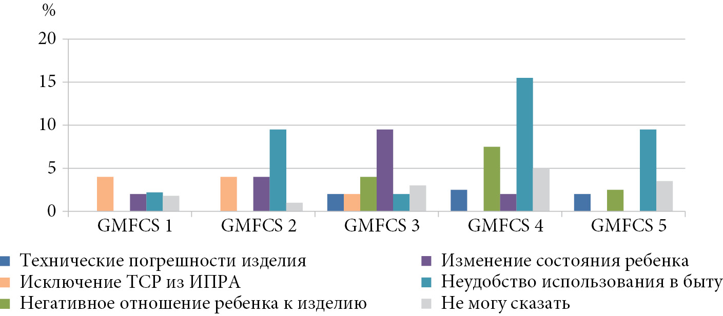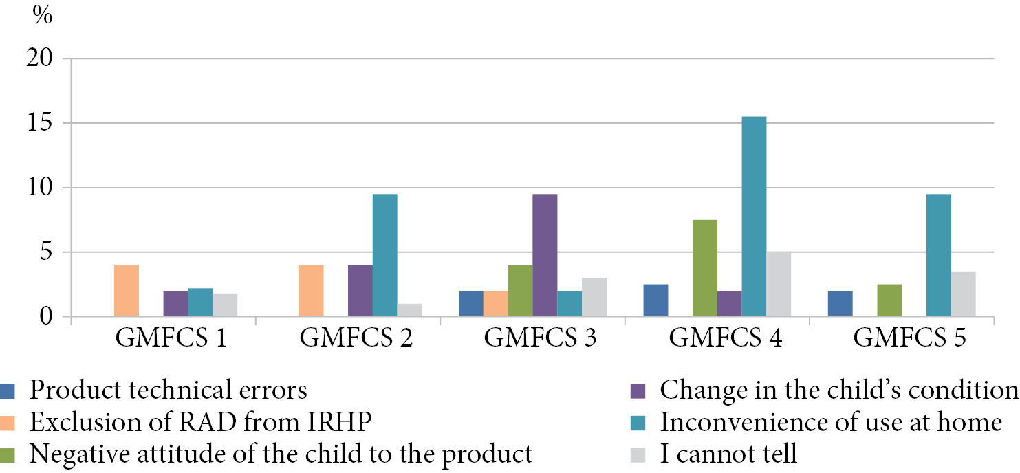 Fig. 4. Distribution of the groups of reasons for refusing to use rehabilitation assistive devices (RAD) depending on the level of the patient’s gross motor functions: IRHP — an individual rehabilitation and habilitation program
