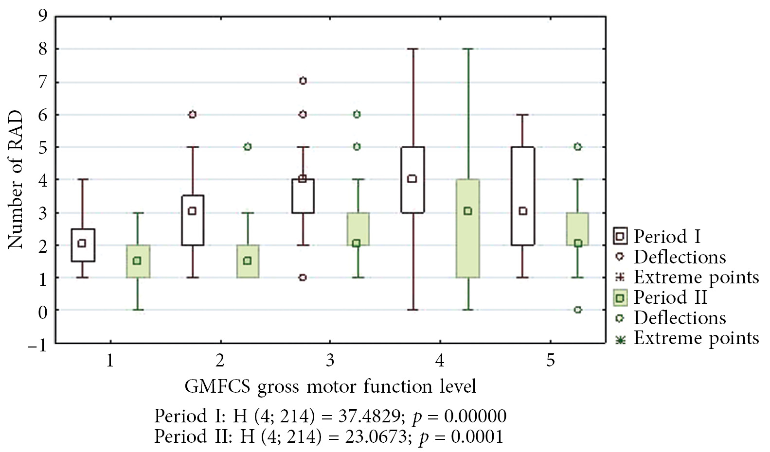 Fig. 1. Number of rehabilitation assistive devices (RAD) used in periods I and II, depending on the level of gross motor functions GMFCS: H — Kruskal–Wallis test