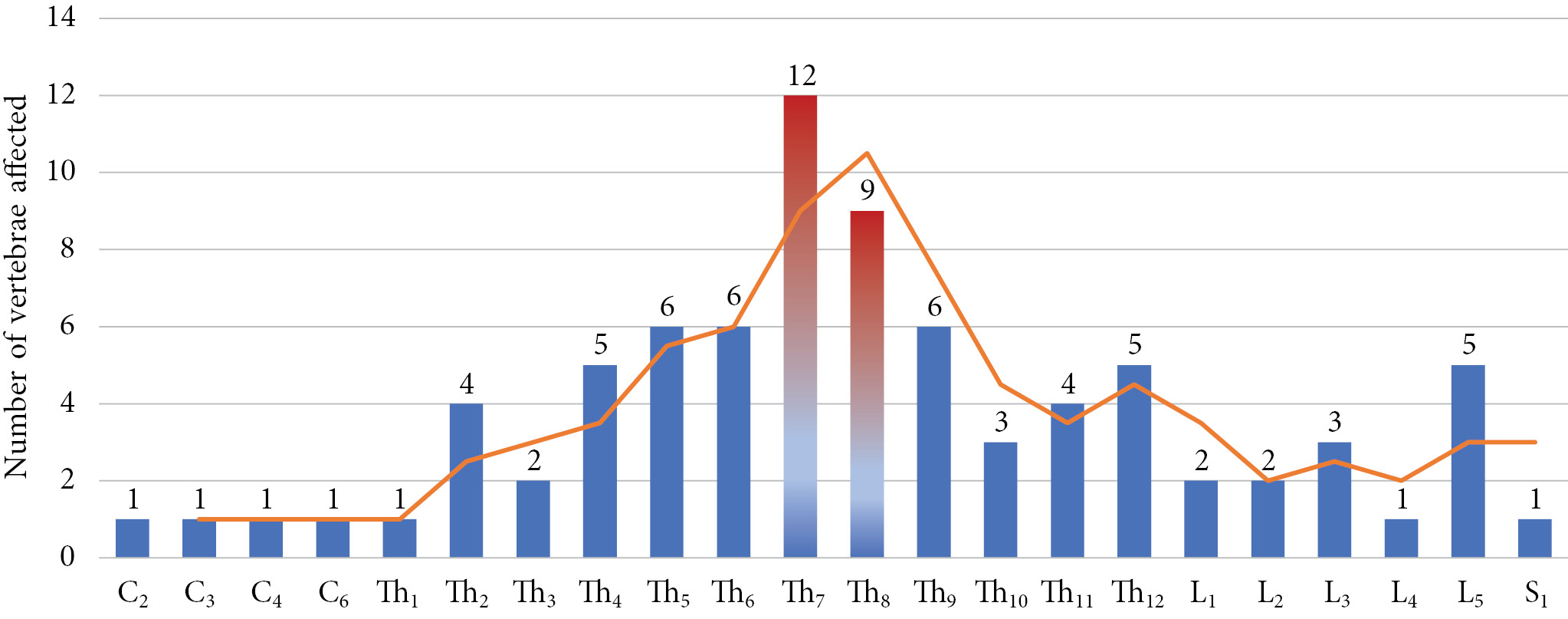 Analysis of the pathology distribution in individual vertebrae showed a significant predominance of lesions at the apex of the physiological kyphosis of Th7–8 (Fig. 1).