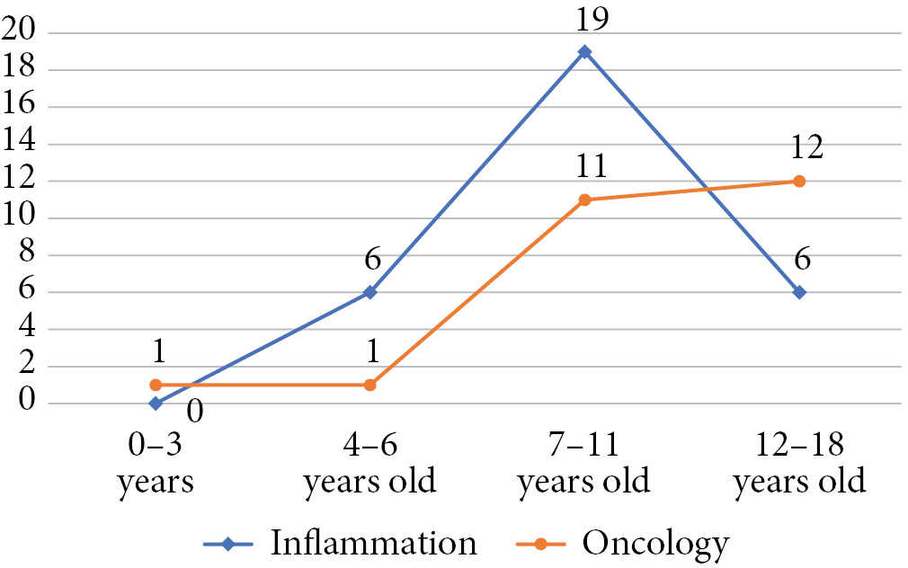 Fig. 3. The number of pediatric patients with inflammatory and tumor lesions of the spine, depending on the age group