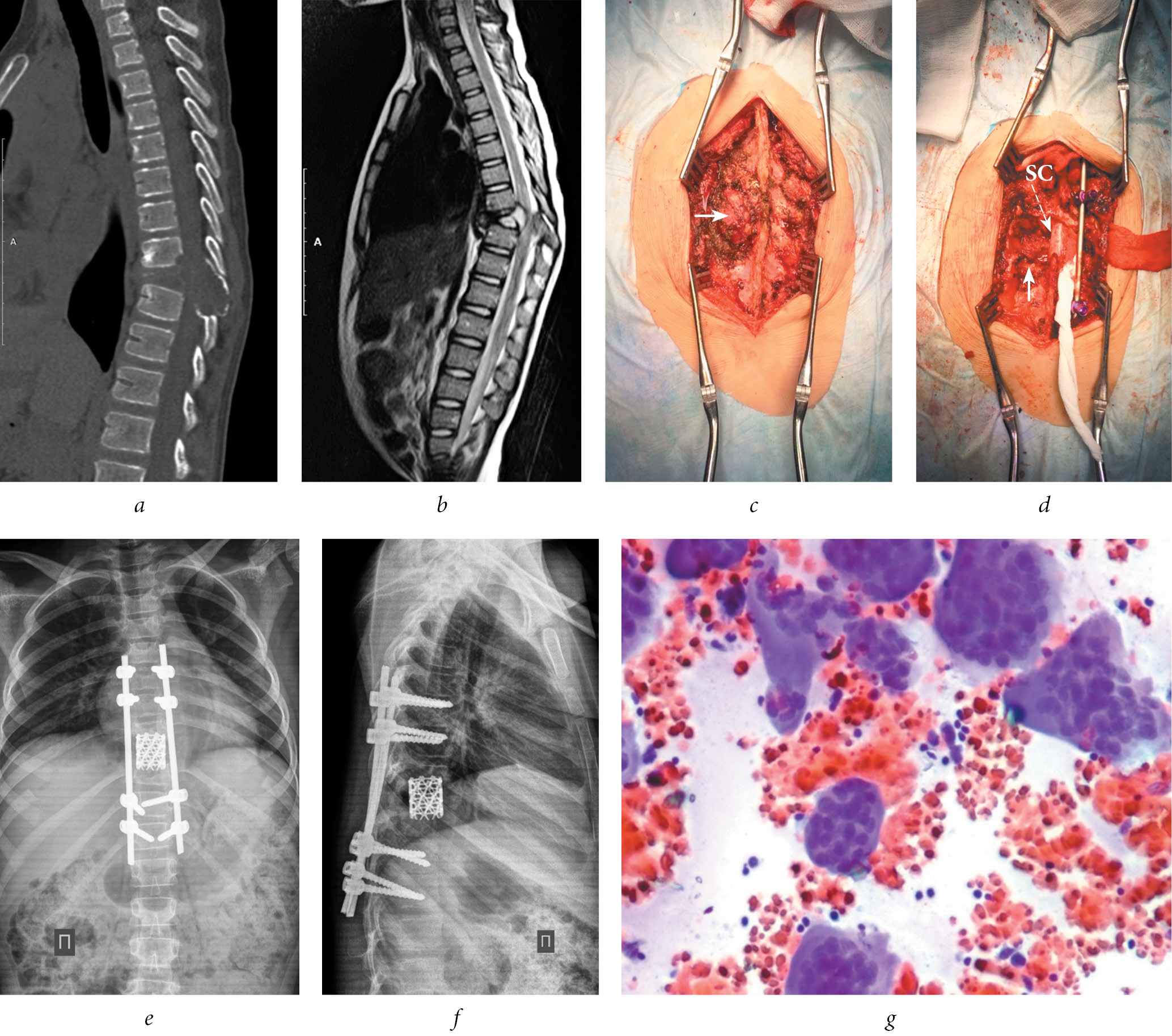 Fig. 4. Pathological fracture of the Th9 vertebra with an aneurysmal bone cyst in an 8-year-old pediatric patient. (a and b) Preoperative mid-sagittal computed tomography and magnetic resonance imaging sections: osteolytic destruction of the ventral and dorsal elements of the Th9 vertebra, local kyphosis of 21°, and compression of the spinal cord with the epidural component of the tumor with a myeloblastic lesion. (c and d) Intraoperative photographs (arrows indicate a tumor and a defect formed after its removal); (e and f) control postoperative radiographs; (g) imprint smear (stained with hematoxylin and eosin, ×100): red blood cells and osteoblast-type giant multinucleated cells. SC, spinal cord
