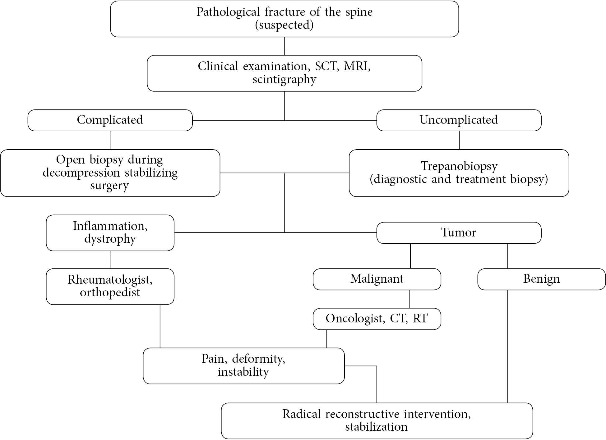 Taking into account interdisciplinary cooperation, it is advisable to provide diagnostic and surgical care to pediatric patients with a pathological fracture of the spine in a specialized center where the pediatric patient needs to be referred in a short time. And in case of neurological disorders or risk of their development, the patient must be hospitalized urgently. Fig. 5 presents the tactical and therapeutic algorithm for pathological spinal fractures in pediatric patients.