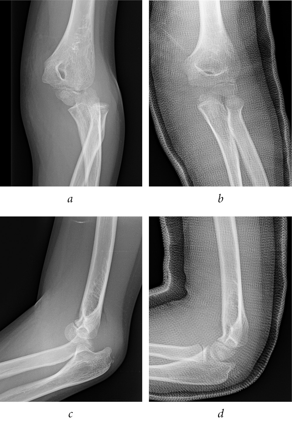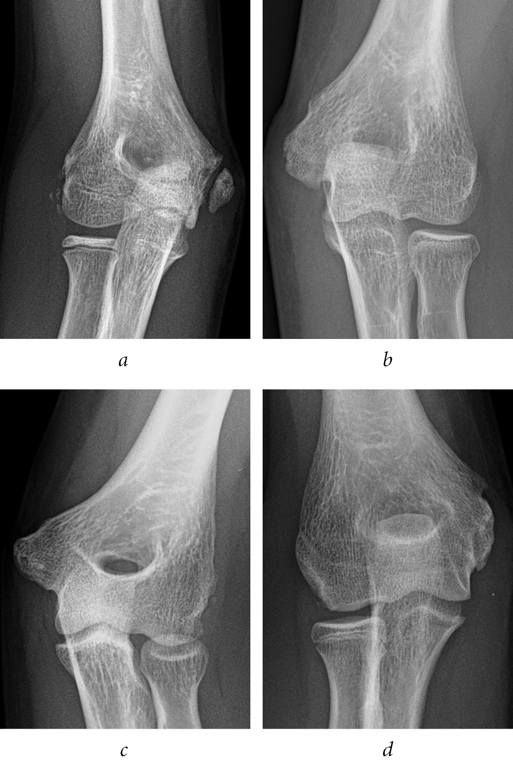 Fig. 1. Patient S. Elbow dislocation with ME intraarticular entrapment: a, b — X-ray of elbow dislocation; c, d — X-ray post-reduction of elbow dislocation with ME intraarticular entrapment