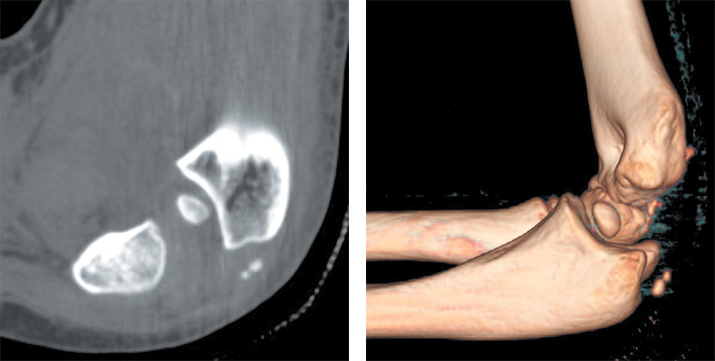 Fig. 2. Patient S. Post reduction CT-scan with 3D reconstruction shows ME intraarticular entrapment