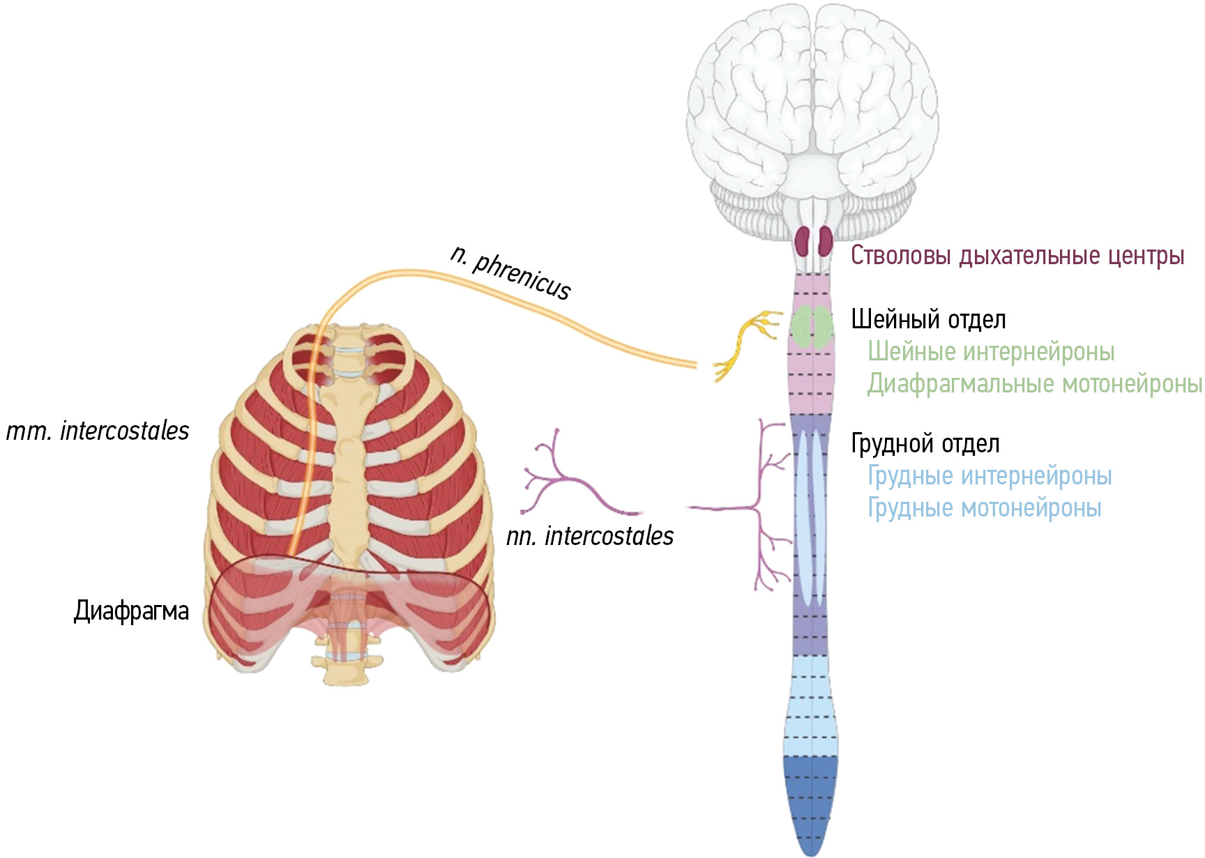 Временные и координационные характеристики дыхания сложны и включают множество нейронных популяций, контролирующих несколько групп мышц (рис. 1). Автоматическое центральное управление ритмом дыхания происходит в дыхательных центрах ствола мозга после интеграции сенсорной обратной связи. Затем бульбоспинальные входы синапсируют на премоторные и моторные нейроны диафрагмальных нервов в шейном отделе спинного мозга (сегменты CIII–CV). Билатеральные диафрагмальные нервы иннервируют основную инспираторную мышцу — диафрагму, которая сокращается, благодаря этому расширяется грудная полость и увеличивается объем легких для механического обмена вдыхаемых газов. Ритмогенные дыхательные центры ствола мозга также синапсируют с мотонейронами грудного отдела спинного мозга, которые в итоге иннервируют наружные межреберные мышцы, ответственные за расширение грудной клетки при вдохе (основной вклад вносят сегменты TI–TIII, а более каудальные мотонейроны грудного отдела спинного мозга дополняют их работу в разной степени). Вспомогательные дыхательные мышцы, используемые для активного дыхания, а также после травмы, включают грудино-ключично-сосцевидную, лестничные, косые мышцы живота, прямые мышцы живота, грудную и внутренние межреберные мышцы.