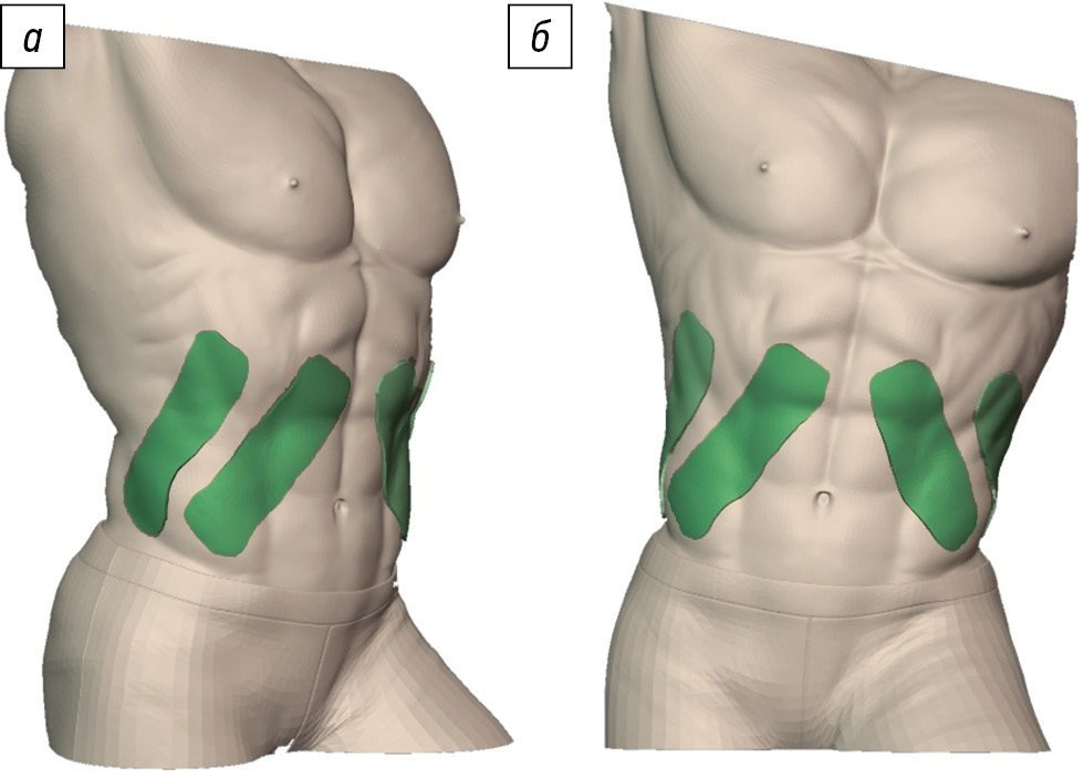 Рис. 2. Схема постеролатерального расположения электродов при абдоминальной функциональной электростимуляции: а — живот под углом 45°; б —живот спереди (отмечены области наложения электродов)