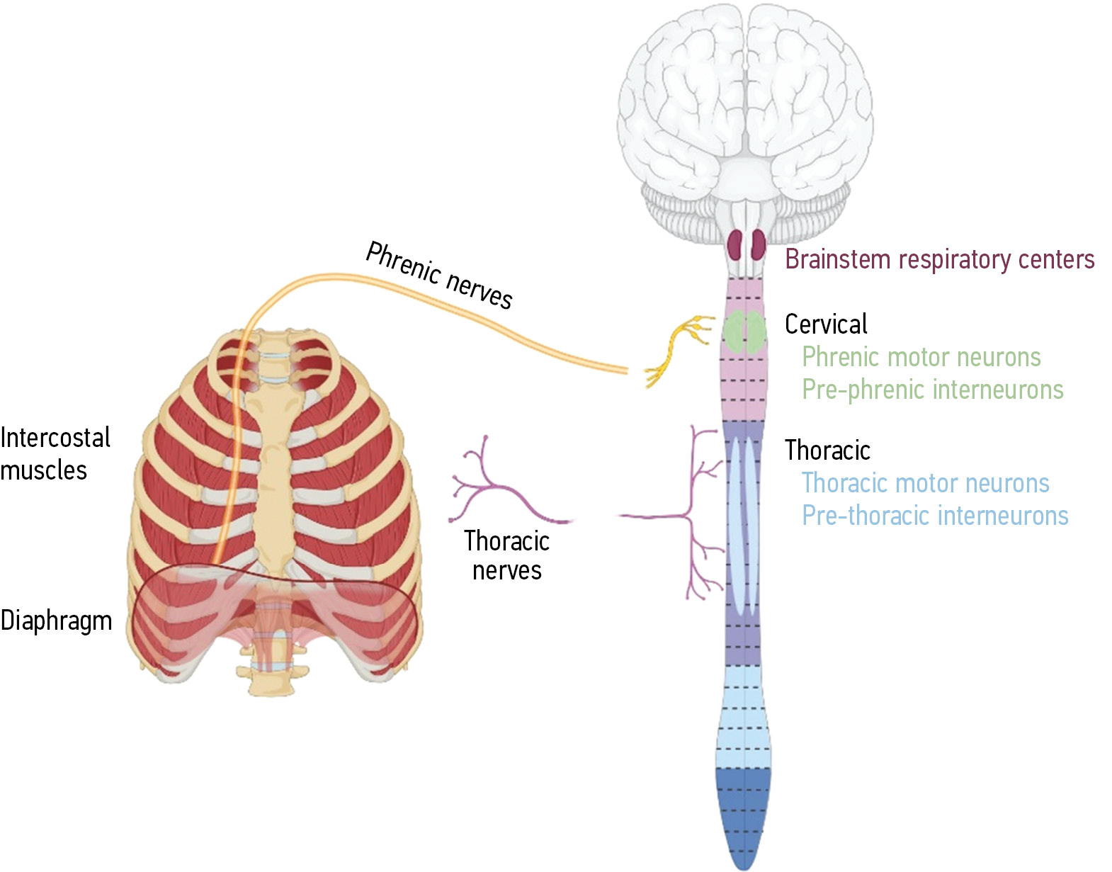 The temporal and coordination characteristics of respiration are complex and include various neuronal populations that control several muscle groups (Fig. 1). Automatic central control of respiratory rhythm occurs in the respiratory centers of the brainstem after the integration of sensory feedback. Bulbospinal inputs synapse to premotor and motor neurons of the phrenic nerves in the cervical spinal cord (segments CIII–CV). The bilateral phrenic nerves innervate the main inspiratory muscle, i.e., the diaphragm, which contracts, thereby expanding the chest cavity and increasing the lung volume for the mechanical exchange of inhaled gases. Rhythmogenic respiratory centers of the brainstem also synapse with motor neurons of the thoracic spinal cord, which ultimately innervate the external intercostal muscles responsible for expanding the chest during inspiration; this is mainly contributed by the TI–TIII segments, and the more caudal motor neurons of the thoracic spinal cord complement their work in varying degrees. Accessory respiratory muscles used for active breathing and after injury include the sternocleidomastoid, scalenus, oblique, rectus abdominis, pectoralis, and internal intercostal muscles.