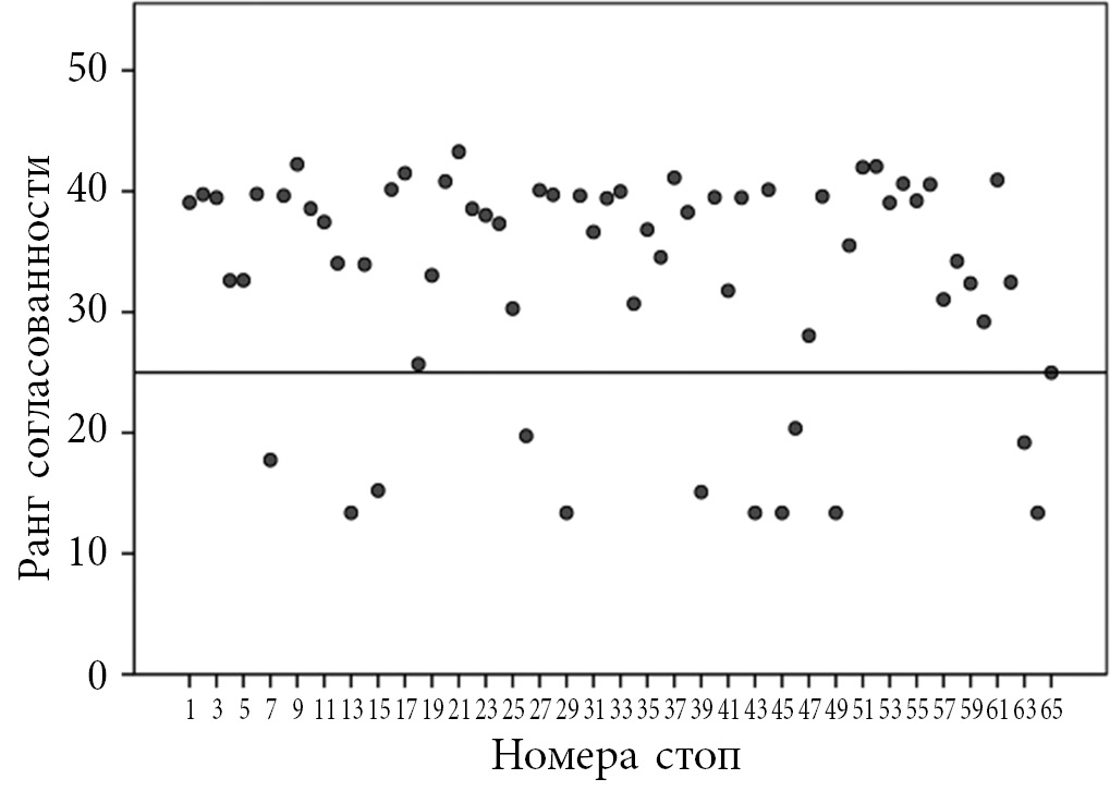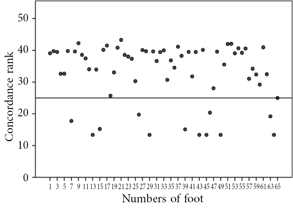 As an example, a scatter diagram illustrates the consistency of the foot arch height as defined by the specialists according to the rank distribution, and Fig. 2 presents that the images of feet under the numbers located below the conditional line are characterized by the highest consistency. Thus, the lower the rank value, the higher the consistency of specialists.