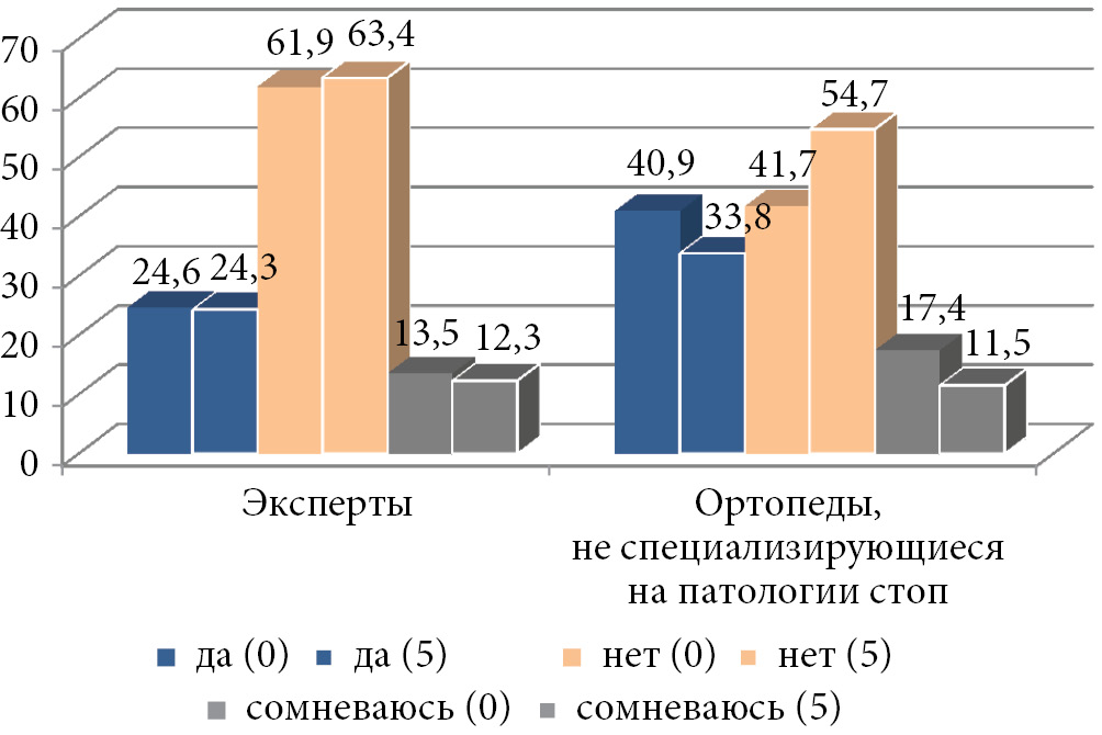 Conclusion. Experts’ answers regarding which foot should be considered flat demonstrated a good and excellent level of consistency. Therefore, they can be used to determine reference values of anthropometric parameters of the medial foot arch.