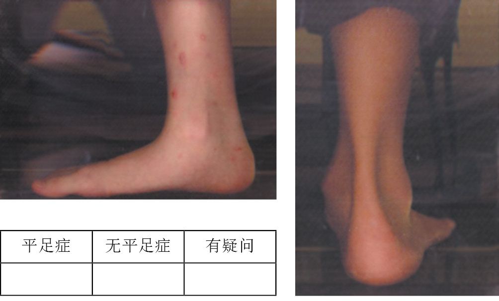 In stage 2, the consistency of visual diagnosis of flatfoot was analyzed. For this purpose, 130 images of the right foot in standard views were randomly selected, namely, the medial lateral and posterior views (by which the visual assessment was made), from each age group (aged 7, 8, 9, 10, and 11 years) in equal numbers (26 images each). Electronic images were presented to 32 orthopedic surgeons (10 of which were medical experts). We considered specialists as orthopedists who have been engaged mainly in foot pathology for more than 5 years. Specialists had to note the preferred response on whether the foot was flat or not. For further statistical analysis, numerical coding of the responses of specialists was performed as follows: 1, “Yes, it is”; 2, “No, it is not”; 3, “I doubt it.” To determine the inter-rater consistency, the criteria for nonparametric statistics were used for к-linked samples with the calculation of the w-Kendall concordance coefficients and the τ-Kendall correlation coefficient. To determine intra-rater consistency, after 5 months, the same specialists received the same images of the feet for analysis (in different order). The repeated assessment involved 20 doctors, including nine specialists. Statistical analysis was performed by calculating the κ-Cohen coefficient. Figure 1 presents an example of an assessment protocol.