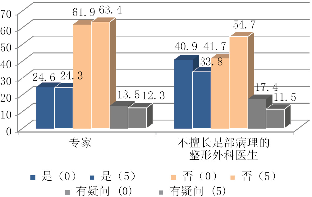To demonstrate clearly the differences in the subjective perception of the foot arch height among specialists and non-specialists in foot pathology, Fig. 3 presents a bar diagram of the percentage of possible responses; thus, as the data show, the frequency of flatfoot according to the responses of specialists on the analyzed images of the feet was 24.6% on average, while it was 40.9% (1.7 times higher) among non-specialists in foot pathology. In this case, in the repeated analysis after 5 months, the frequency of flatfoot was 24.3 and 33.8%, respectively. Thus, the responses of the specialists were stable over time. The same tendency was noted with respect to the feet with medium and high arches. That is, specialists reported that 61.9% (initial) and 63.4% (repeated) of the feet had medium and high arches, while non-specialists in foot pathology presented 41.7% (initial) and 54.7% (repeated) for this indicator. Moreover, the share of the “doubt” responses did not significantly differ between the two groups of orthopedists (Fig. 3).