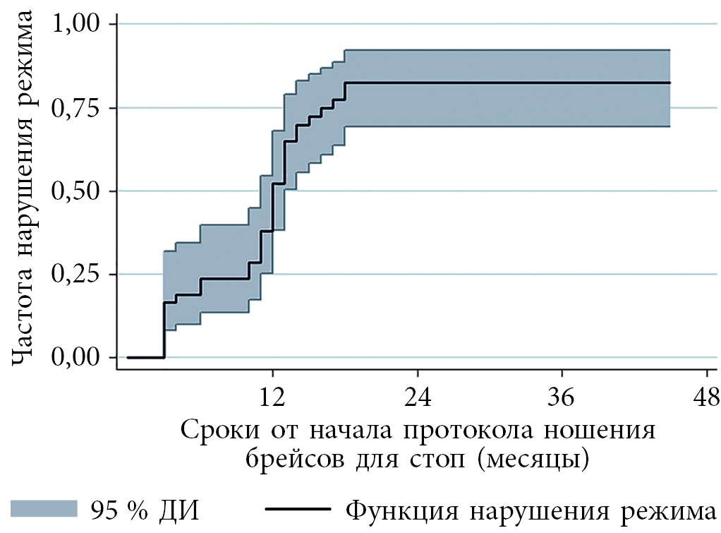 During the maintenance of the ICF correction by FAB, 25 children (60%) used the traditional Denis Browne type of FAB while 17 children (40%) used the articulated type (Dobbs bar). As reported by the caregivers, full compliance with FAB was noted in eight of 42 children. The deviation from the FAB protocol started at an average of 10.3 ± 4.8 months (range, 3–18) after the initiation of the FAB protocol. The noncompliance rate during the maintenance phase of the FAB was 0.82 (95% CI 0.69–0.92) after 18 months since the initiation of the FAB protocol as demonstrated by the Kaplan-Meier analysis in Fig. 3.