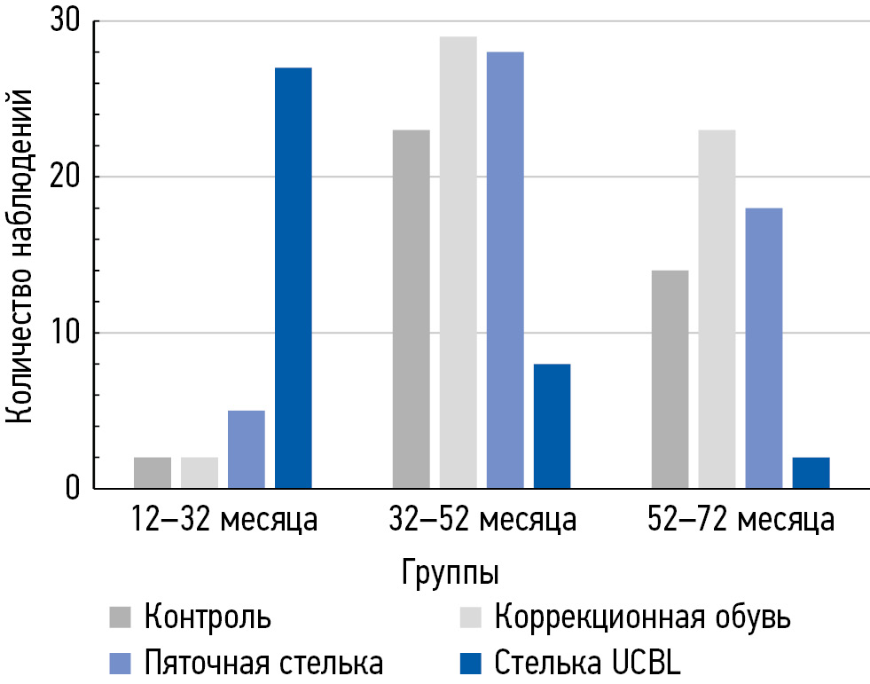 В нашем исследовании возрастной диапазон от 1 до 6 лет выбран в связи с тем, что пик клинических проблем и родительской тревоги приходится на этот возрастной промежуток. Минимальный возраст начала лечения был снижен до 1 года по рекомендации подиатров, которые настаивали на как можно более раннем лечении, прежде чем деформация не станет «необратимой». Мы не хотели исследовать только старших детей с выраженной пронацией стопы. Кроме того, маленькие дети составляют значительную часть пациентов с плоскостопием, встречающихся в клинической практике. Мы установили верхний возрастной предел 6 лет, так как в более старшем возрасте влияние общества, обусловливающее преимущественное ношение спортивной или иной модной обуви, лишает практичности идею лечения с помощью стелек или ортопедической обуви.