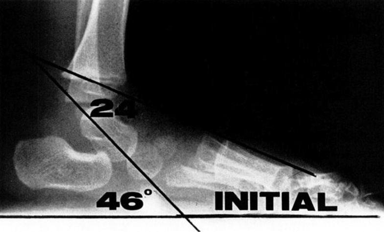 Рис. 3-A. Типичный пациент. Исходная рентгенография стопы в положении «стоя», боковая проекция: таранно-подошвенный угол (46°) и угол между таранной и I плюсневой костями (24°)